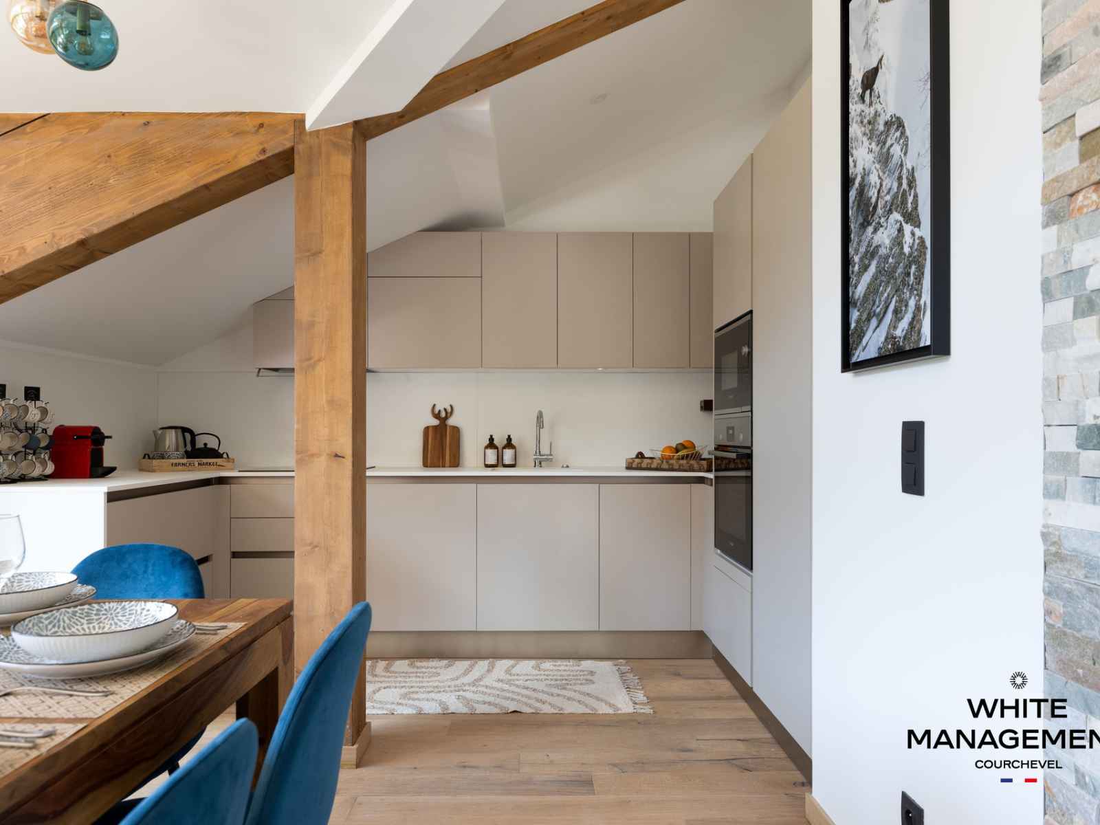bois, une cuisine ouverte équipée haut de gamme et un espace repas pour 8 personnes. Décoré avec goût et équipé de matériel de qualité, ce penthouse est la promesse de vacances réussies.
