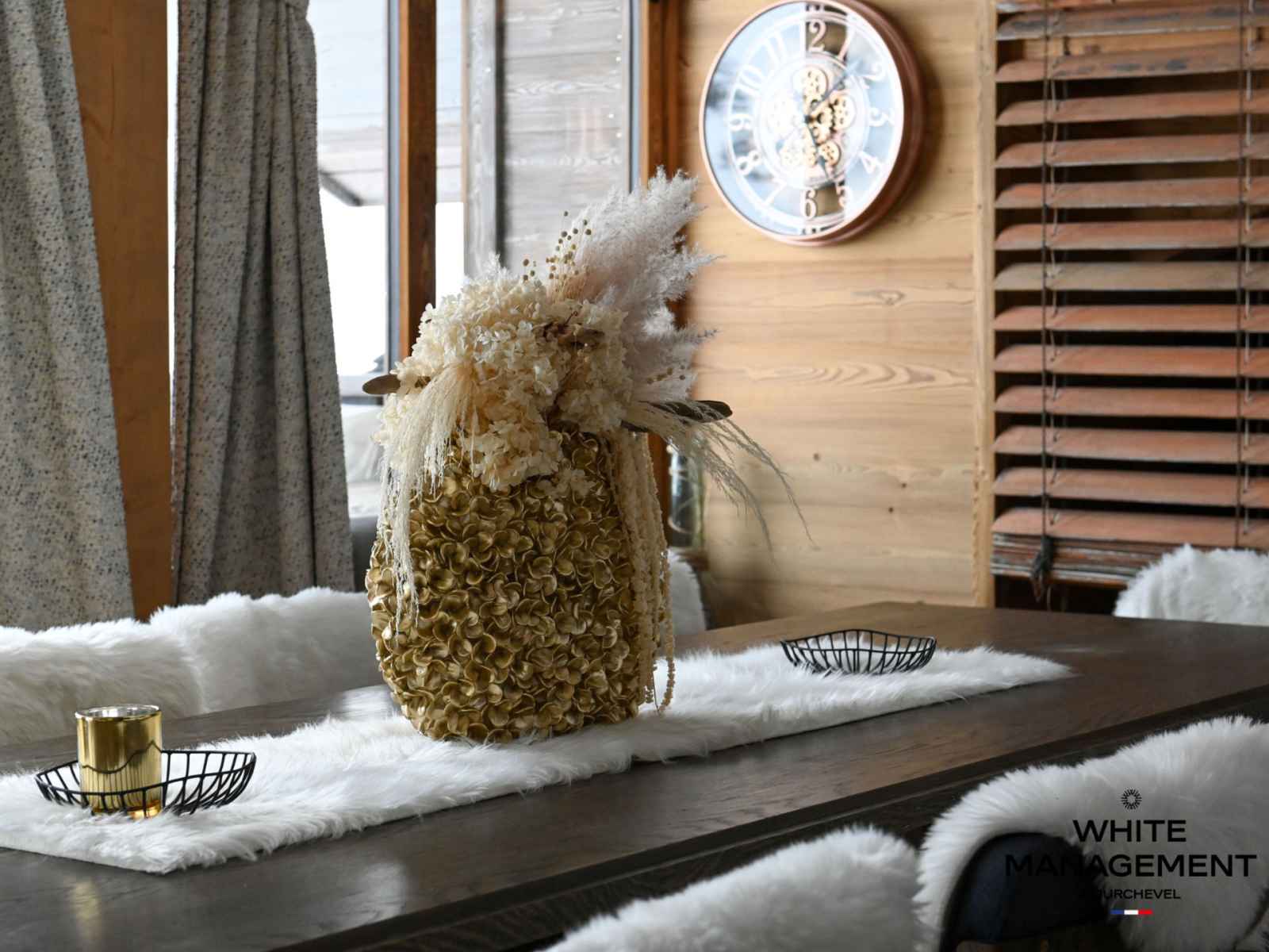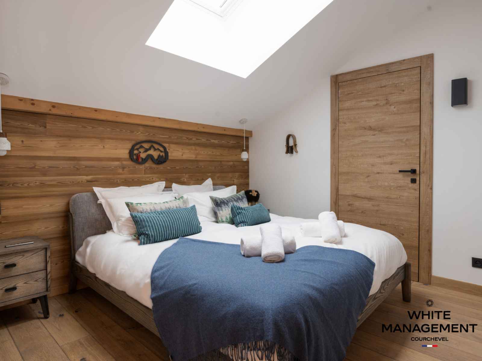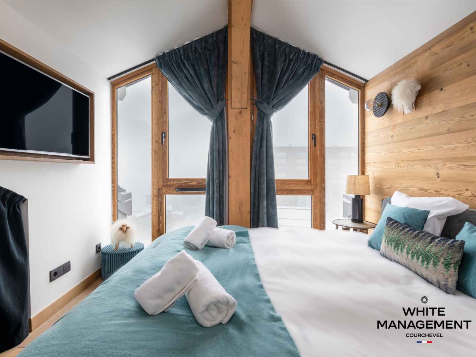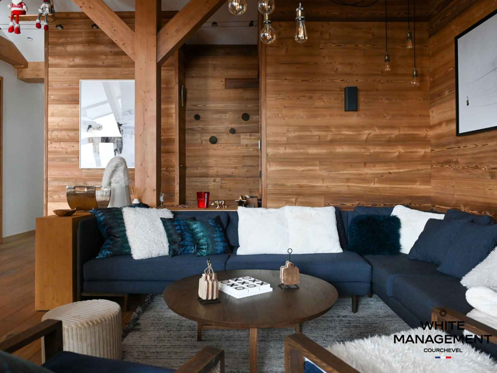 Rénovée en 2019, l'emblématique résidence ourse bleue a été décorée dans la tradition montagnarde.