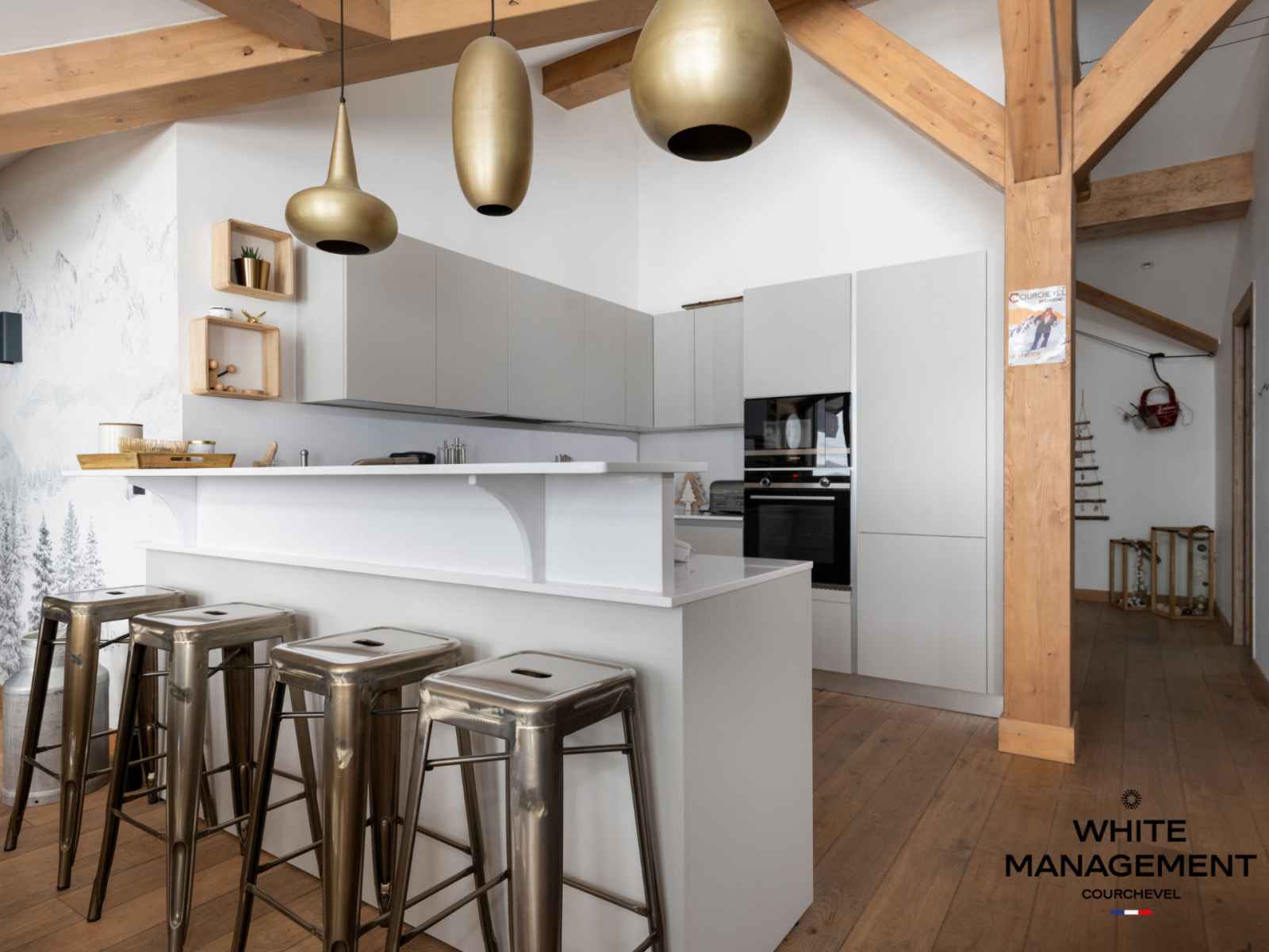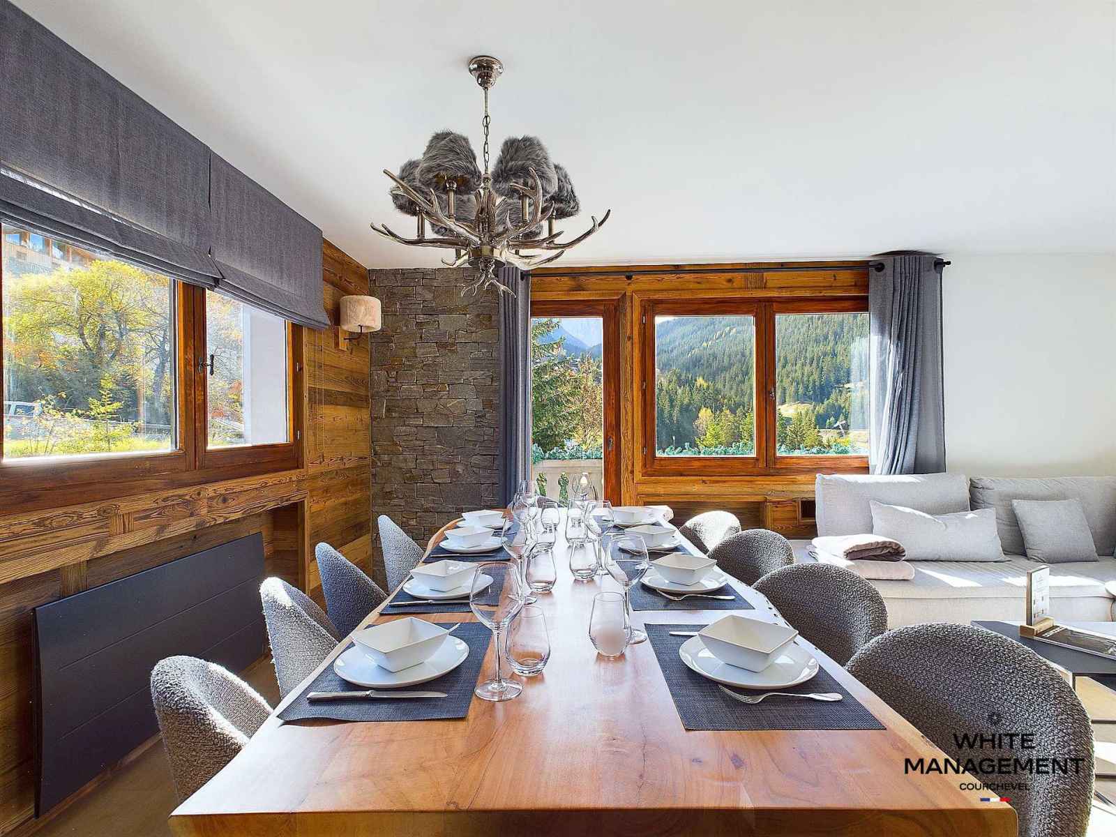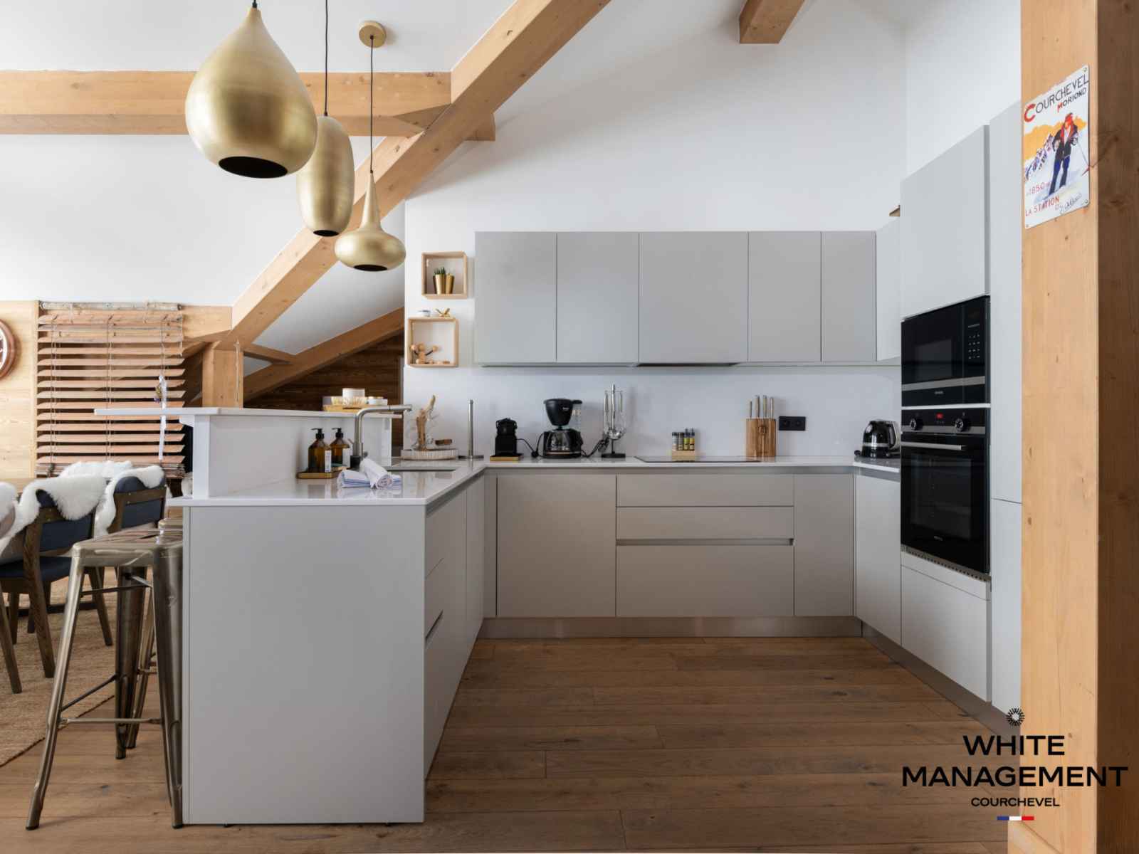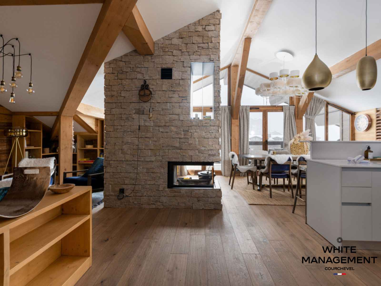 une cuisine ouverte sur un bel espace repas offrant une superbe vue sur les sommets environnants. Ce penthouse décoré avec goût offre également 4 belles chambres, 4 salles de bains dont 2 en suite, et un grand sauna privatif.
