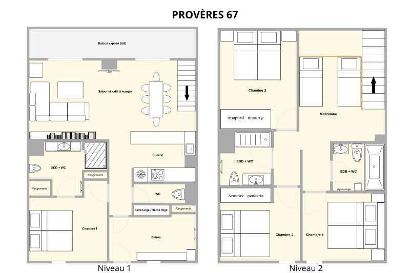 ouverte : 3 plaques à induction, four, frigo, lave-vaisselle, bouilloire électrique, grille-pain, cafetière à filtre, cafetière Nespresso, hotte Chambre 1 : 2 lits simples (80x190) - salle de douche en suite avec une douche italienne et toilettes Toilettes séparées Etage supérieur: Chambre 2 : 2 lits simples (80x200) Chambre 3 (avec 2 vélux) : 2 lits simples (80x200) Chambre 4 : 2 lits simples (80x200) Mezzanine ouverte sur le séjour : 1 ensemble de lits gigognes (80x200) Salle de bain avec toilettes et Salle de douche avec toilettes 1 machine à laver et 1 sèche-linge - Vue magnifique - accès au balcon avec transats Accès INTERNET PRIVE HAUT DEBIT GRATUIT (dépendante de l'opérateur, ne peut être garantie) NON FUMEURS ANIMAUX INTERDITS pour votre séjour mais des animaux y séjournent avec les propriétaires de l’appartement LES PLUS DE VOTRE SÉJOUR : lits faits à l'arrivée, serviettes de bain fournies, ménage de fin de séjour inclus, sèche chaussures dans l'entrée