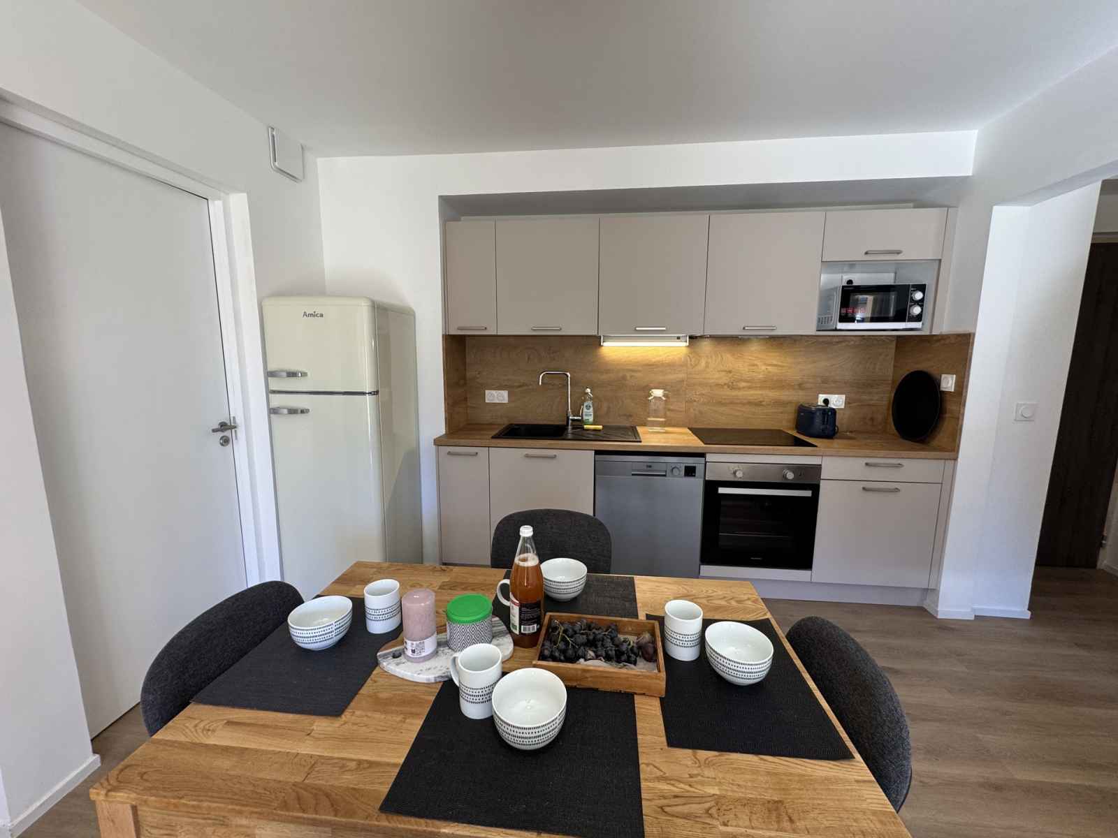 un coin cuisine avec réfrigérateur, lave-vaisselle, four micro-ondes, plaque vitrocéramique, cafetière