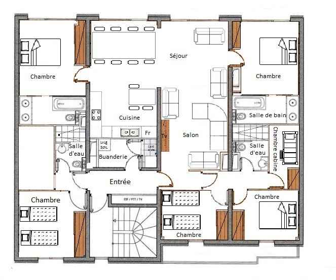 au coeur de la station et à moins de 2 minutes des pistes, au niveau 4 d'une résidence sans ascenseur (l'entrée se trouvant au niveau 5). Les couchages A votre disposition 2 chambres avec salle de bains et wc attenants composées d'un lit double (160cm) chacune. Une chambre avec 2 lits simples (2 x 90 cm). Une chambre avec 1 lit double (160 cm). Une chambre avec une ensemble de lits superposés (2 x 80 cm). Une chambre cabine avec un ensemble de lits superposés (2 x 80cm). Les sanitaires 2 salles de bains avec baignoire et WC et 2 salles de douches avec WC La cuisine ouverte sur le séjour Elle est toute équipée avec plaques vitrocéramiques, un four, un micro-ondes, un lave vaisselle et un réfrigérateur avec congélateur. Les équipements complémentaires Une télévision, WIFI inclus, un lave linge et un sèche linge et un casier à skis. Informations supplementaires Nos amis les animaux ne sont pas tolérés dans cet appartement. Appartement non fumeur Le linge de lit, de toilette et lits faits à l’arrivée sont inclus sauf pour les courts séjours et en été. Possibilité de réserver des forfaits de ski avec tarif avantageux (hors vacances scolaires)