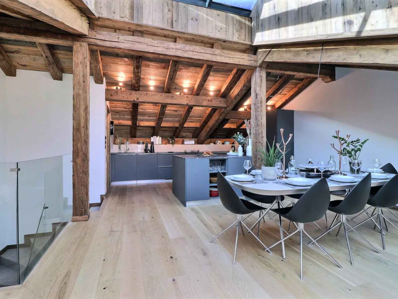 - Une cuisine moderne entièrement équipée, ouverte sur une salle à manger chaleureuse