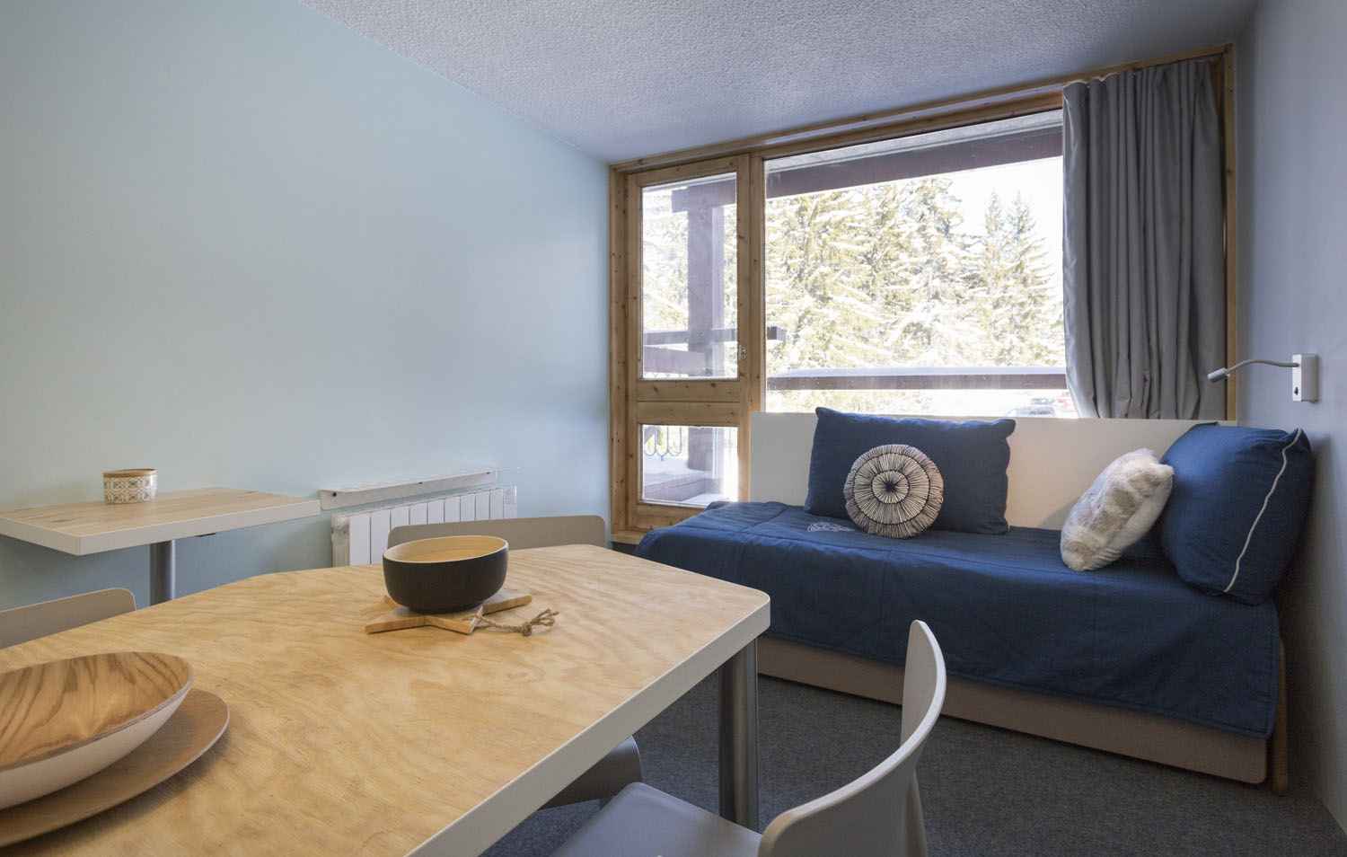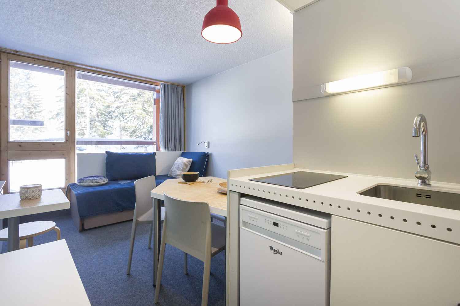 équipé d'1 banquette lit + 1 lit gigogne permettant un couchage pour 2 personnes en 160cm, et TV Sol moquette. Kichenette comprenant : 2 plaques vitrocéramique, four combiné (grill+micro-ondes), réfrigérateur, lave vaisselle, bouilloire, cafetière électrique à filtre, et grille pain. Salle de bain avec WC Linge de lit, de bain et ménage fin de séjour en supplément. Placard à skis Animaux refusés. Non fumeur. Cristaux Paradiski 2 Wifi station gratuit.