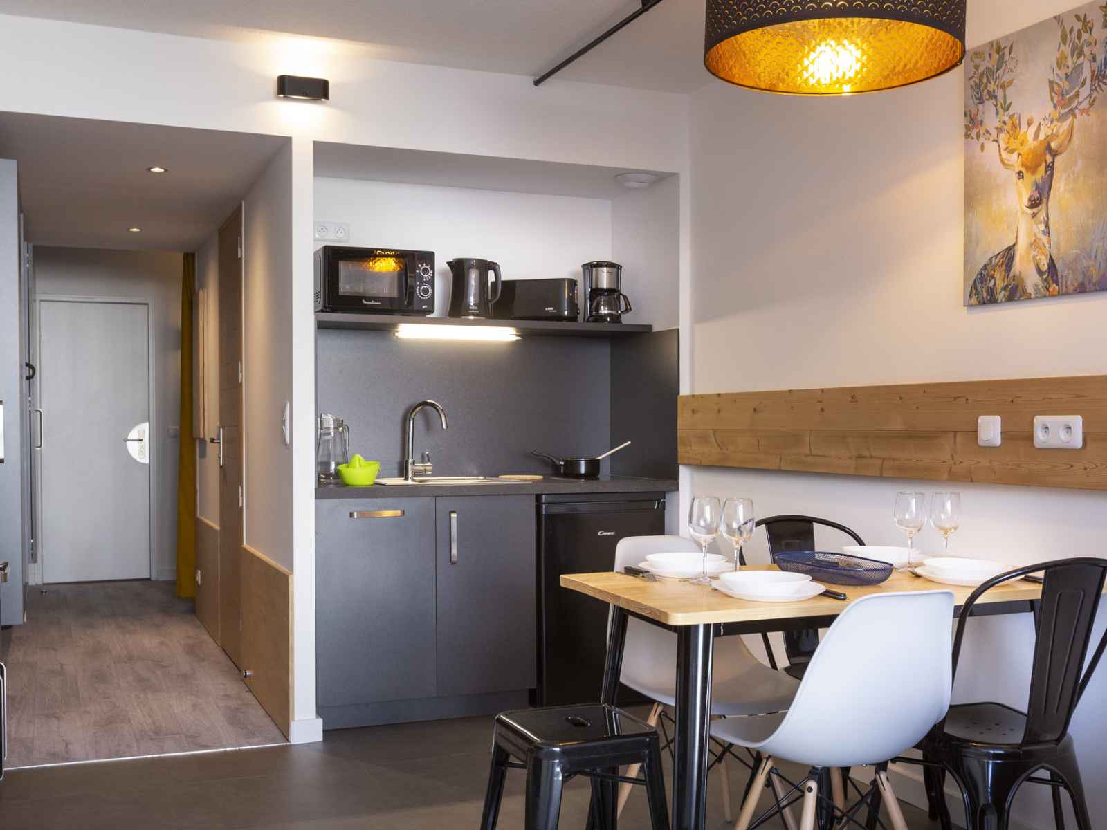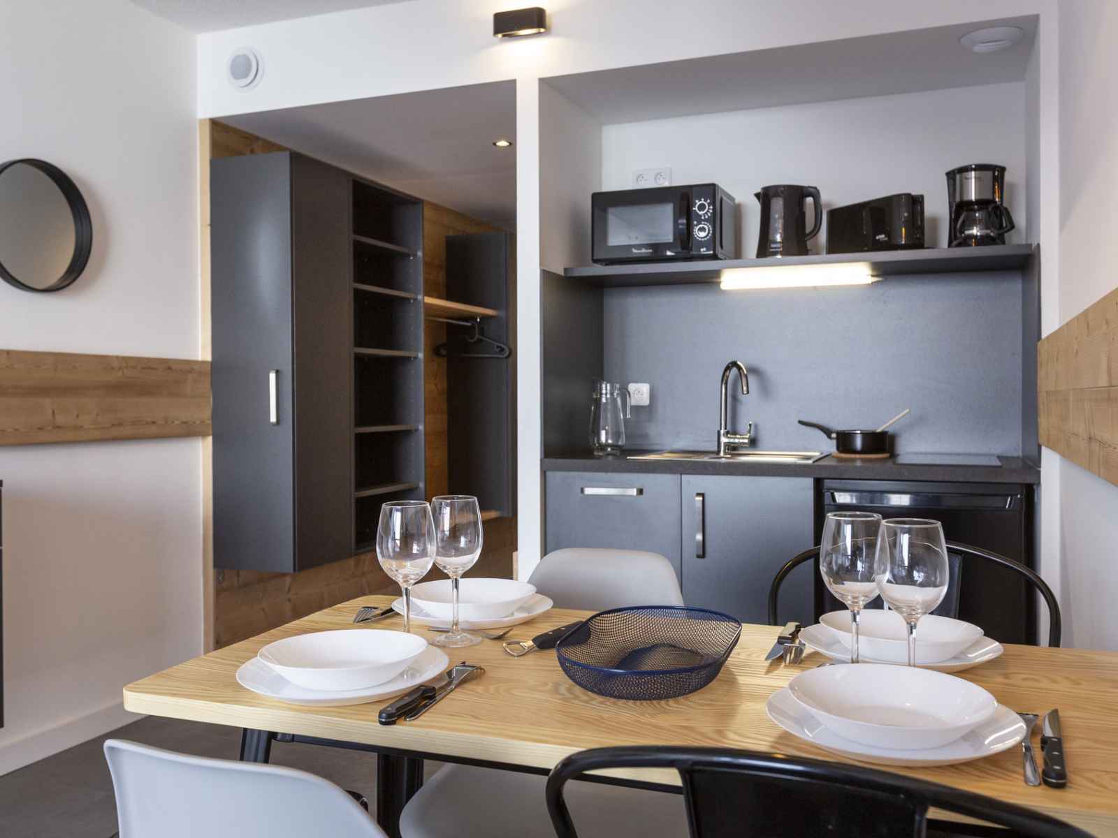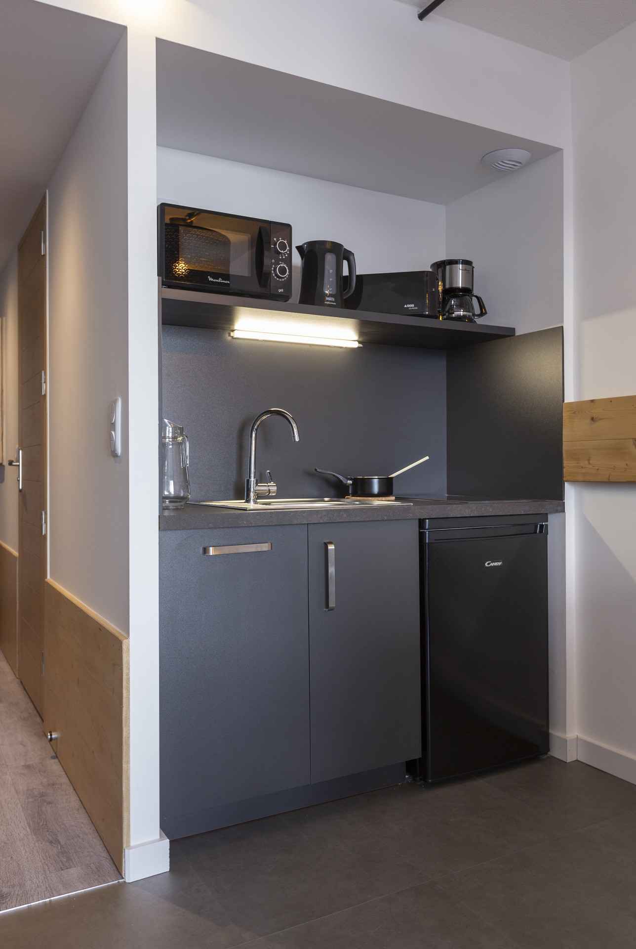 canapé convertible avec lit gigogne permettent un couchage double en 160cm TV avec port USB Sol en flotex et lino pour la cuisine Cuisine comprenant : micro-ondes, lave-vaisselle, grille-pain, bouilloire, cafetière électrique à filtre + Nespresso, 2 plaques vitrocéramique et réfrigérateur/freezer Salle de bain avec WC Placard à skis à l'intérieur de l'appartement Linge de lit, de bain et ménage fin de séjour en supplément. Non fumeur Animaux refusés WIFI gratuit