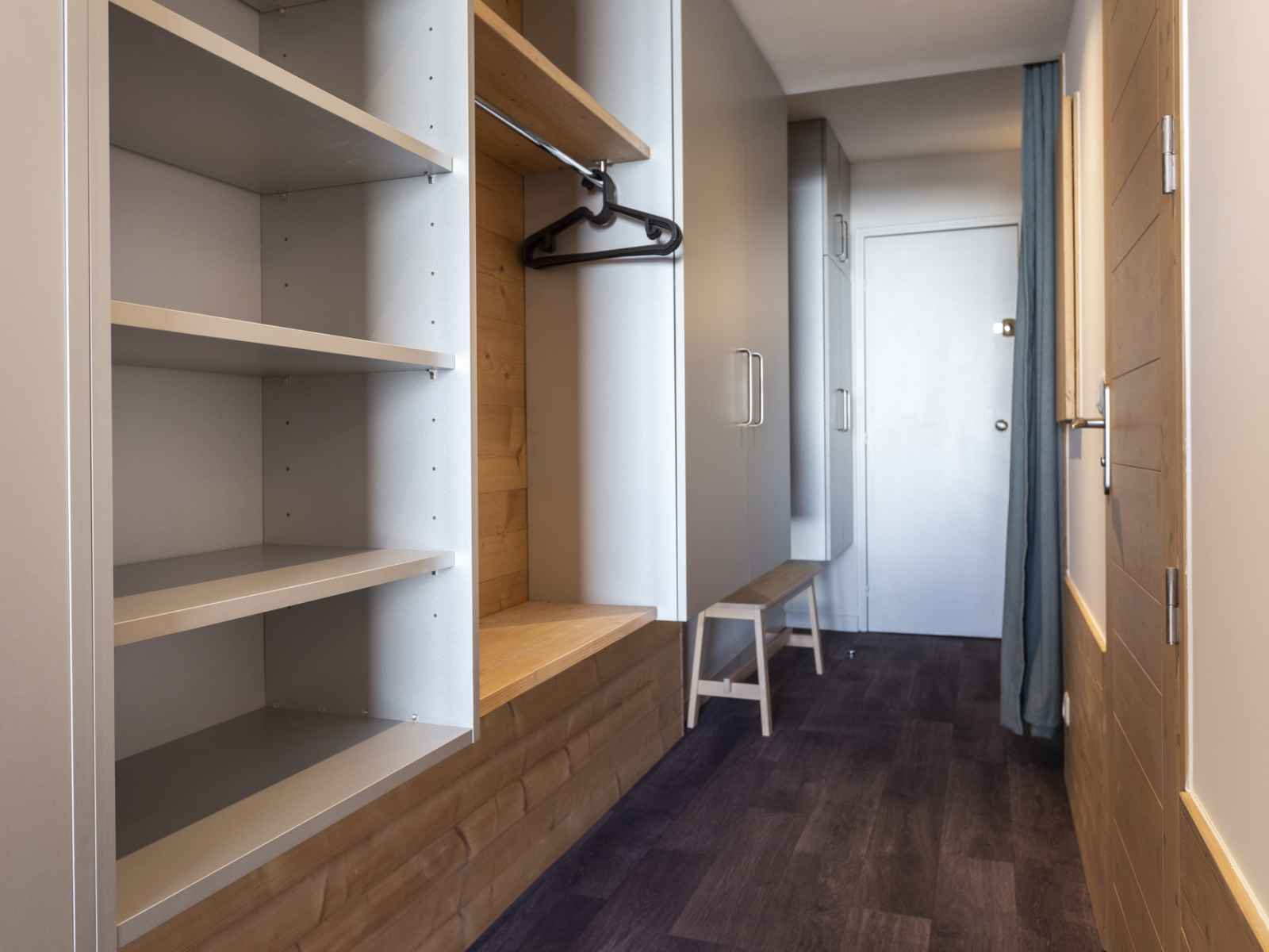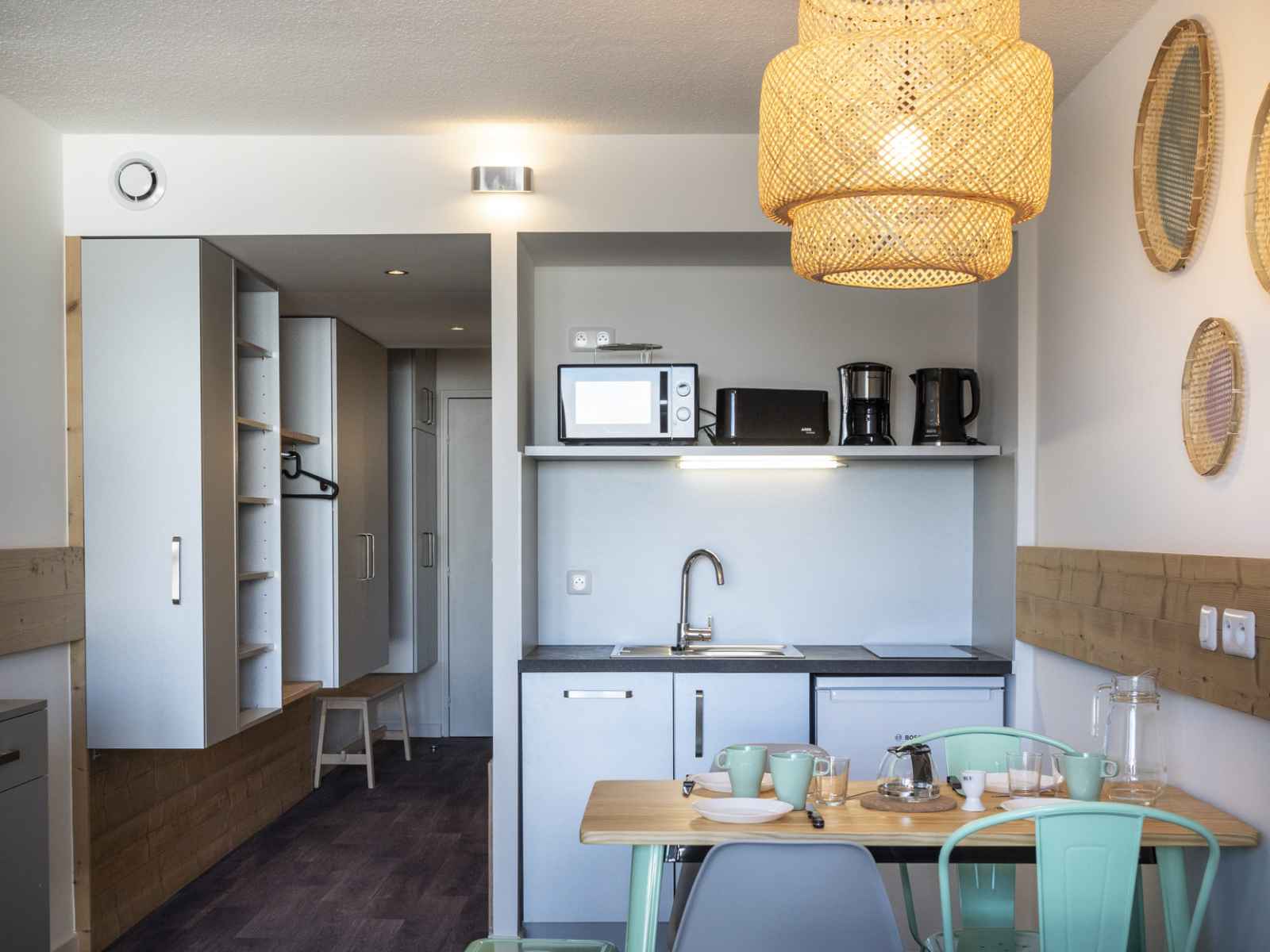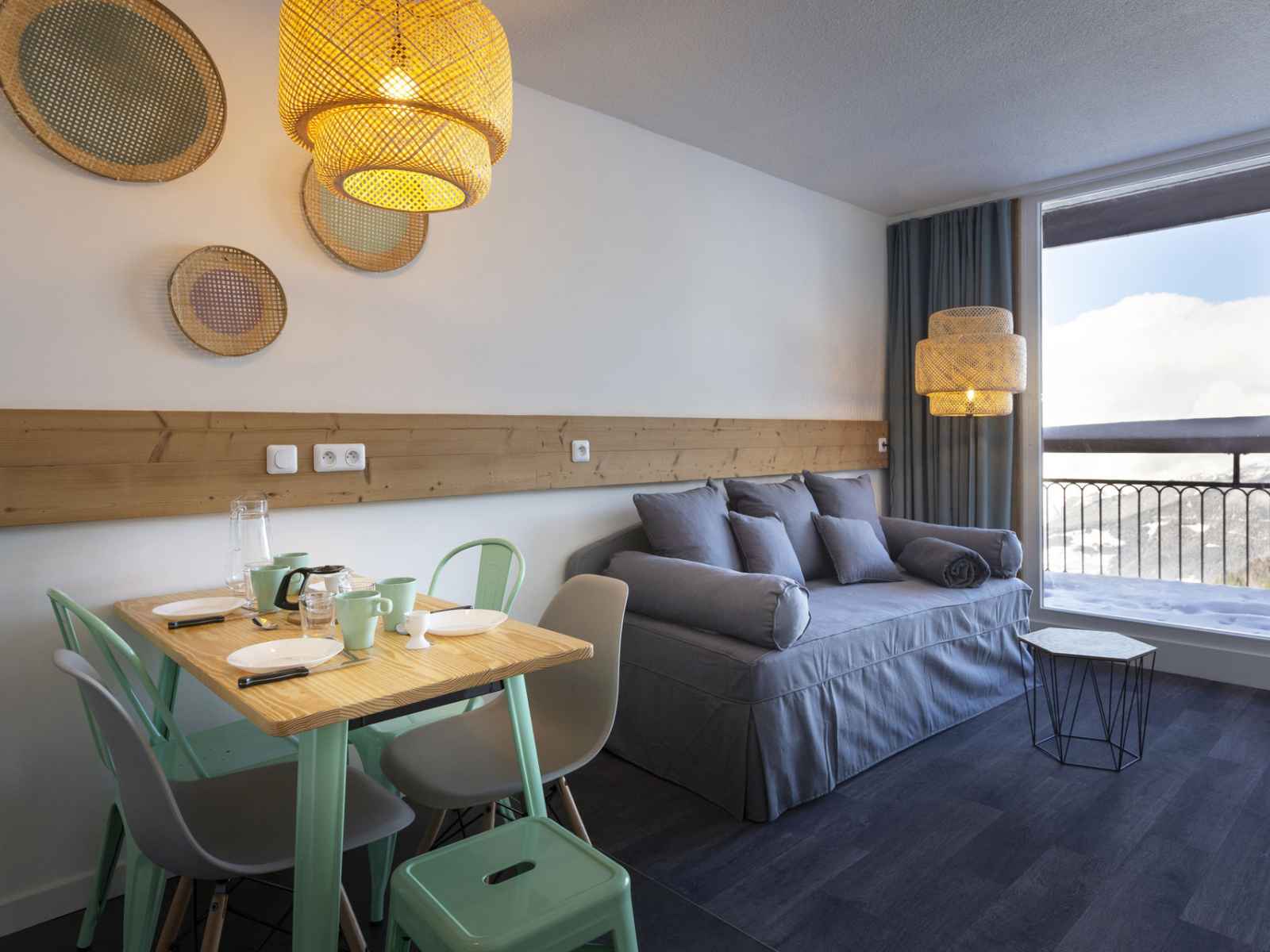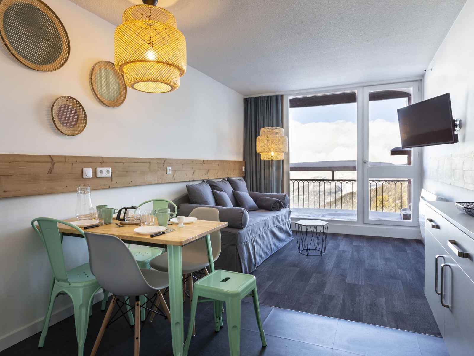 Studio cabine rénové et coloré d'une superficie de 28m² pour 4 personnes, situé au 8ème étage de la résidence varet 2, balcon exposé nord/nord-ouest avec vue côté mont blanc