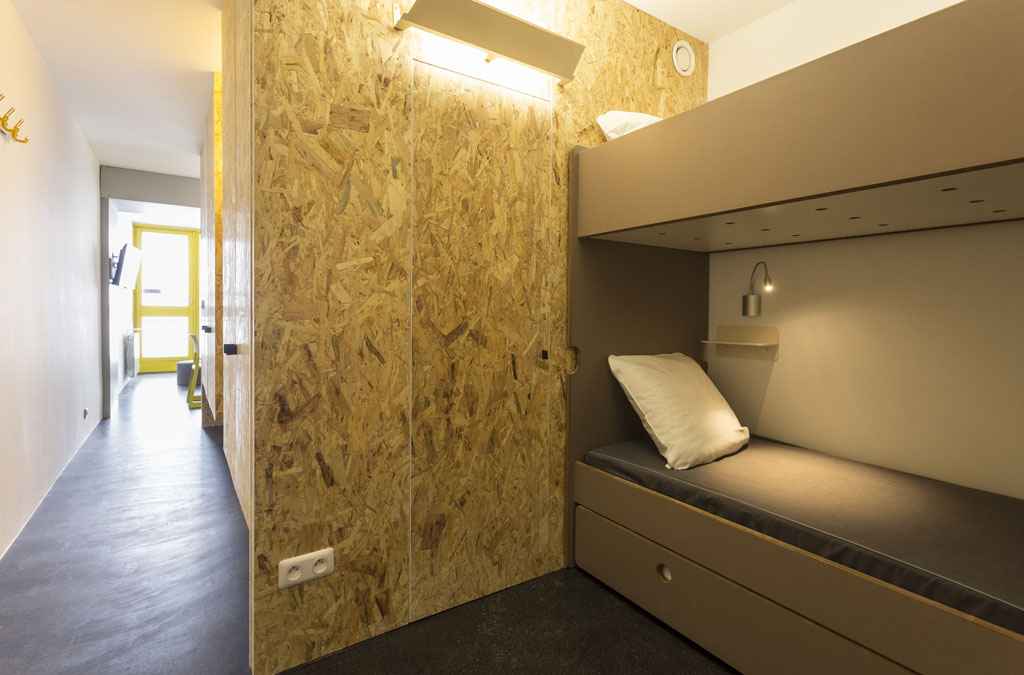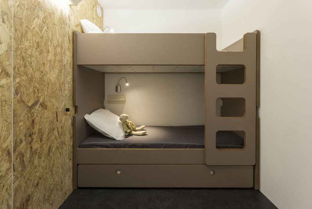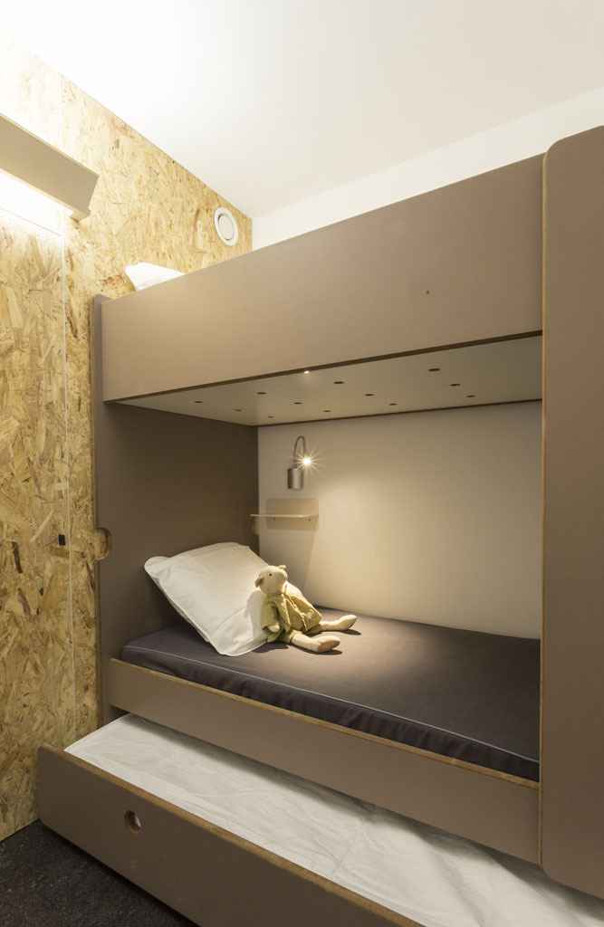 entrée avec 2 lits superposés et 1 lit gigogne en 80cm (le couchage en hauteur ne convient pas aux enfants de - 6ans)