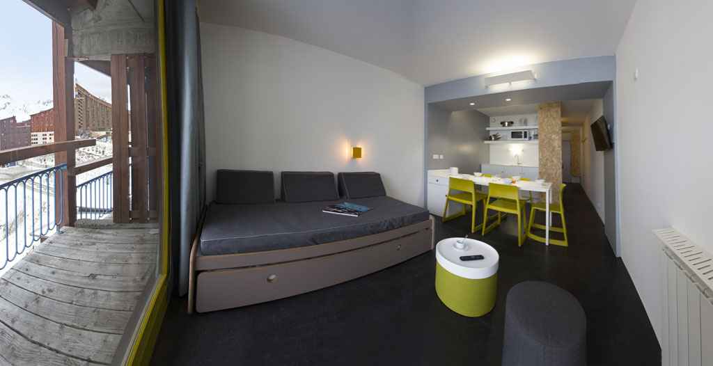 Studio cabine rénové et coloré d'une superficie de 29m² pour 5 personnes, situé au 10ème étage de la résidence varet 3, balcon exposé sud/sud-est avec vue sur la station et les pistes