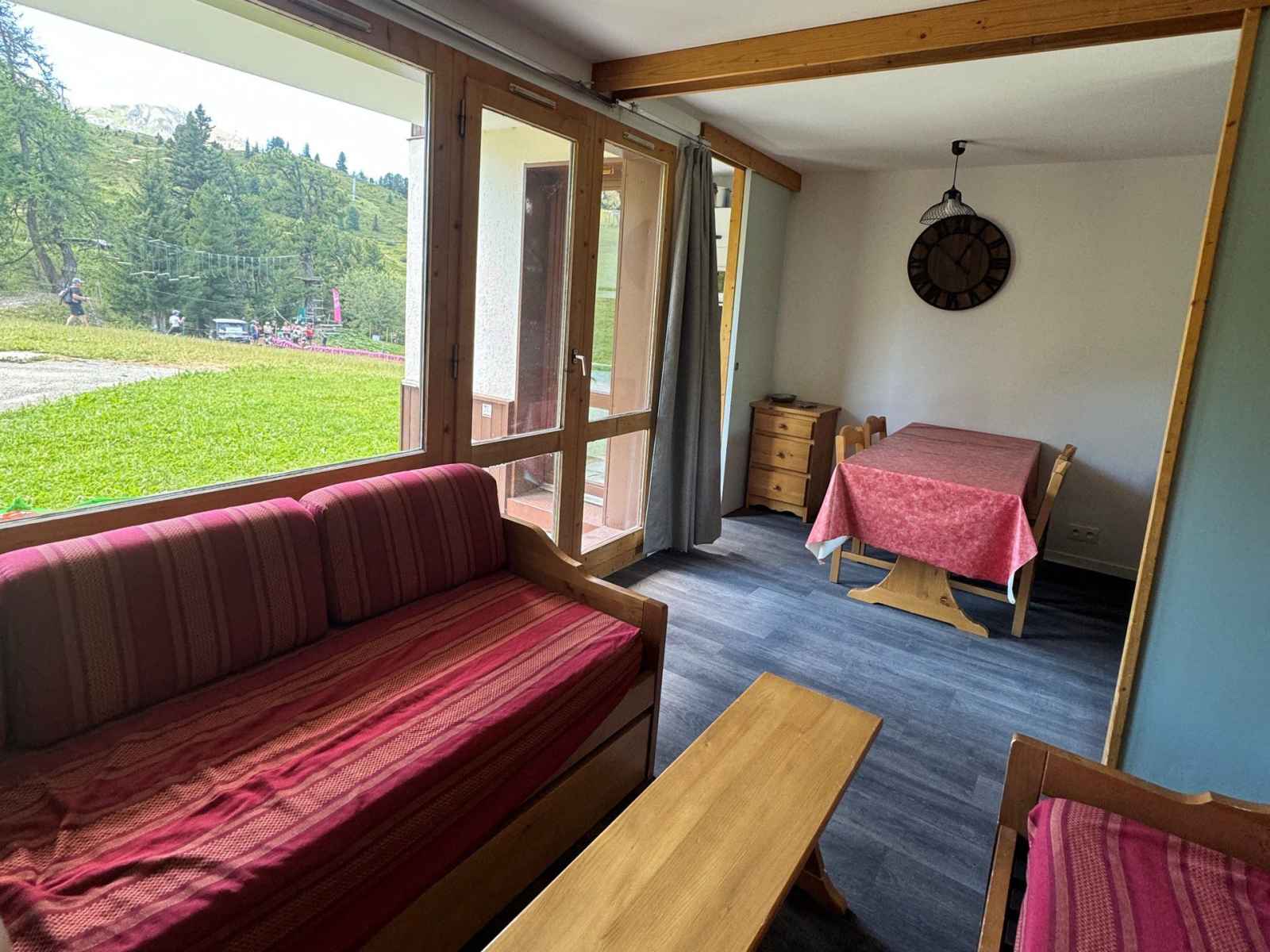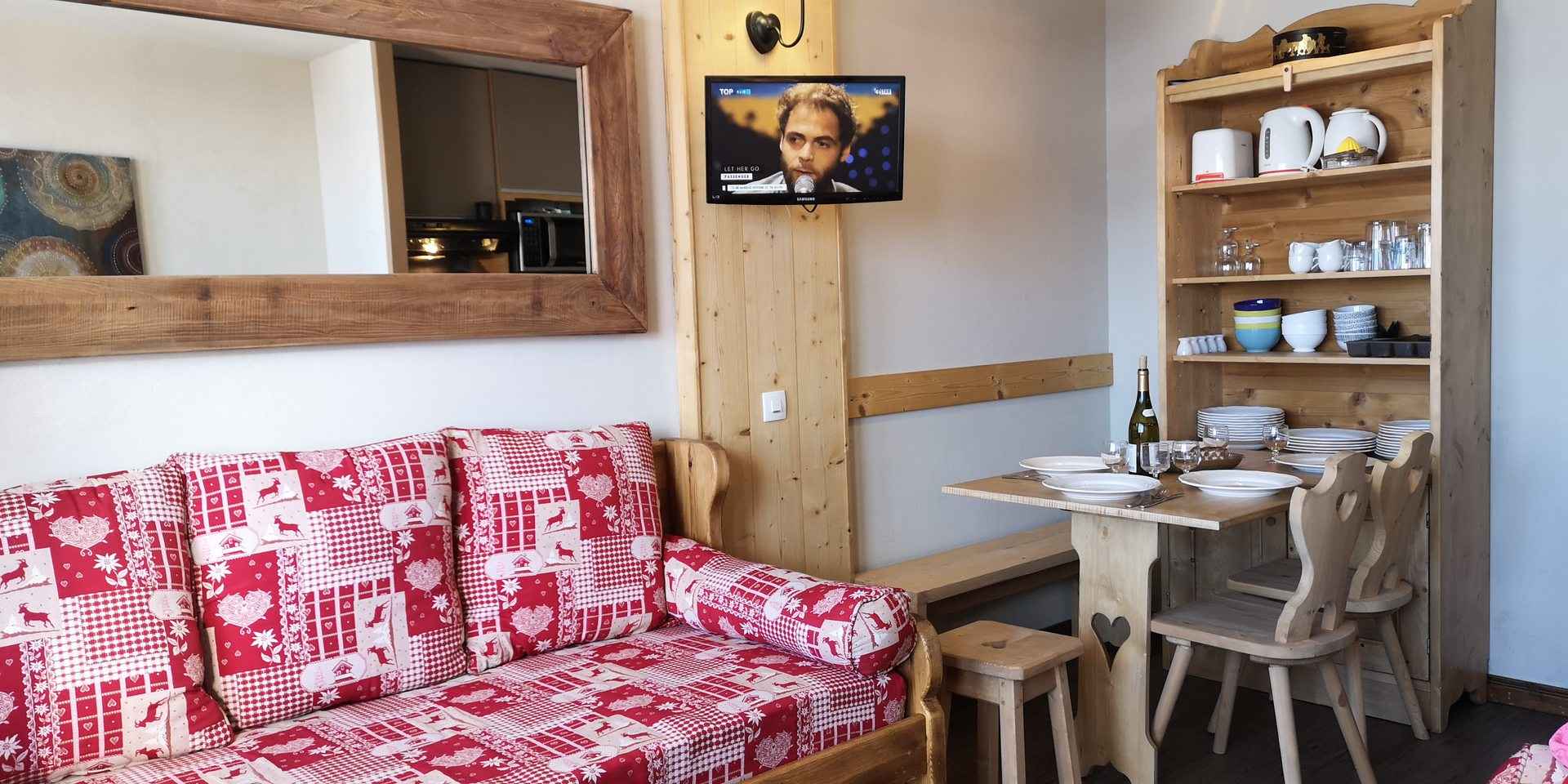 il est situé au sud et au rez-de-chaussée avec une terrasse et vue sur les pistes.