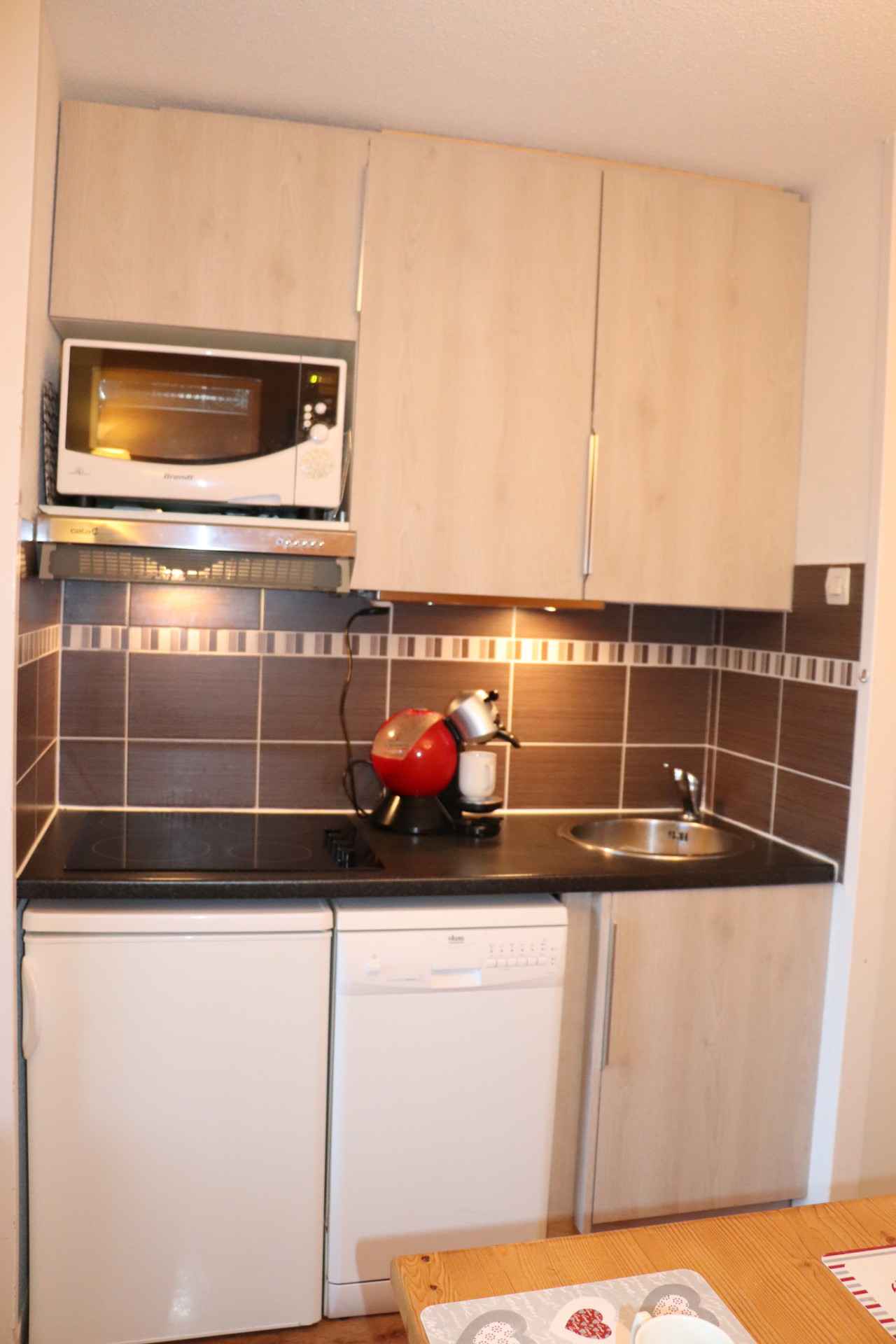 cuisine : dans le séjour équipé d'un four micro ondes grill, un lave vaisselle, 1 plaque vitrocéramique 4 feux et un réfrigérateur.