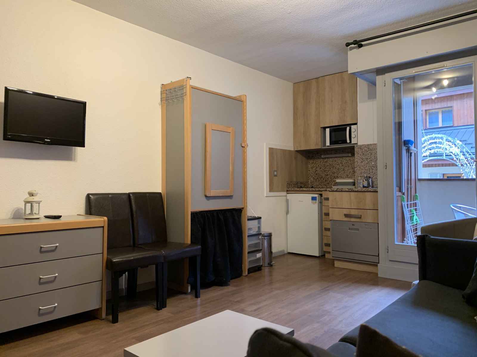 Studio coin montagne de 25 m² avec balcon exposé sud pour 4 personnes au 2° étage avec ascenseur. vue sur la rue commerçante de brides les bains, à proximité des commerces, restaurants et thermes.