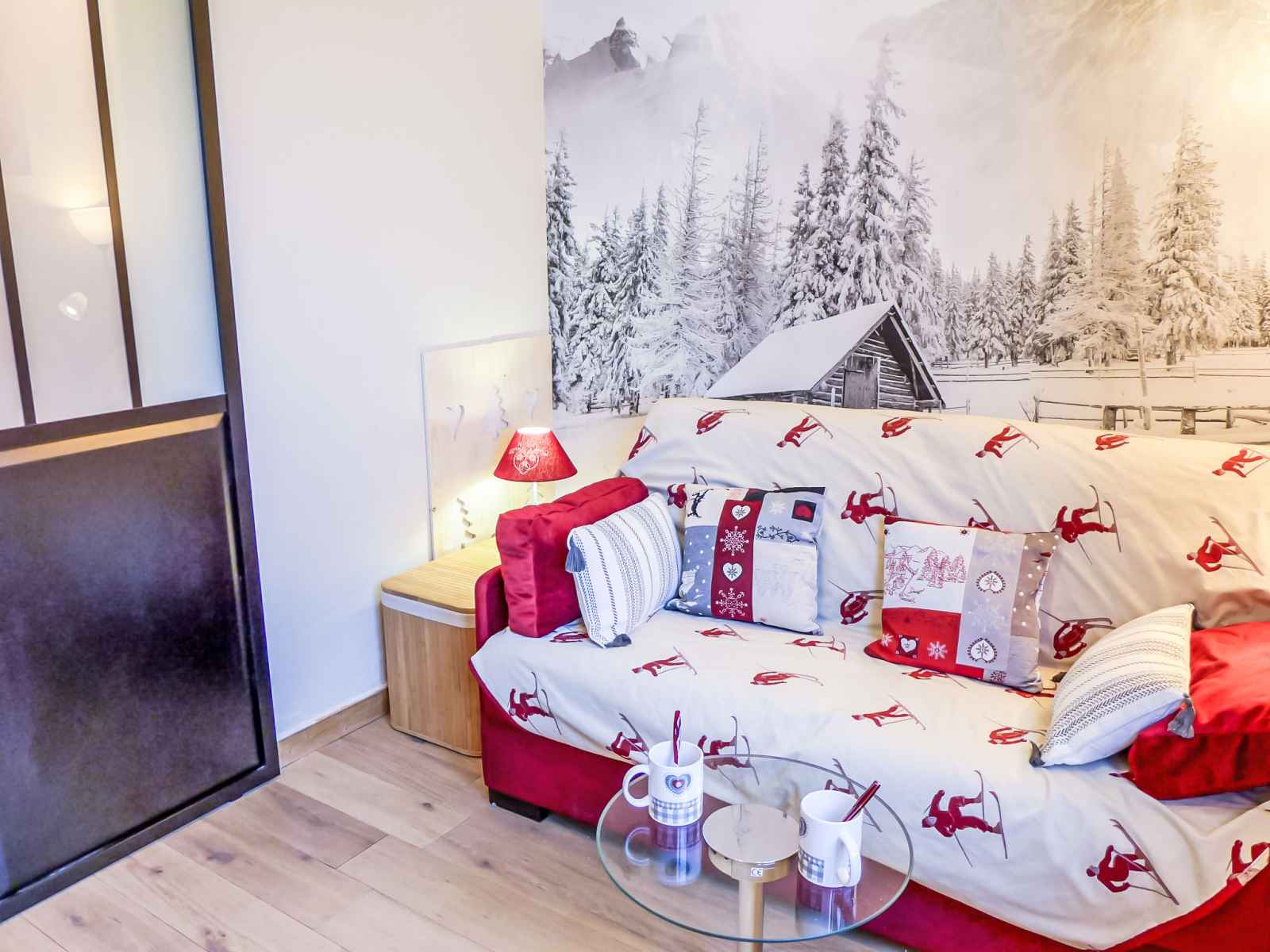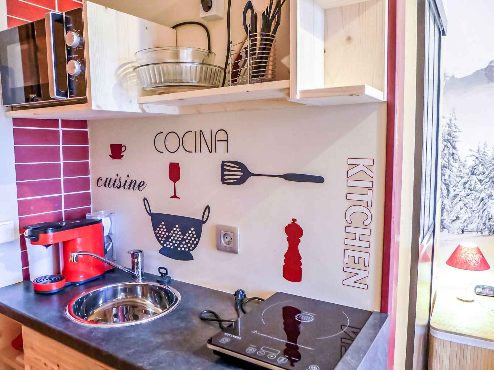 Studio 12 m2 au 4ème étage, situation est. séjour/salle à manger avec 1 divan-lit double (140 cm, longueur 190 cm), tv. coin cuisine (1 plaques à induction, bouilloire électrique, micro-ondes, cafetière électrique). douche/wc. belle vue sur les montagnes. a disposition: internet (connexion wifi, en sus). veuillez noter: tv seulement fr.