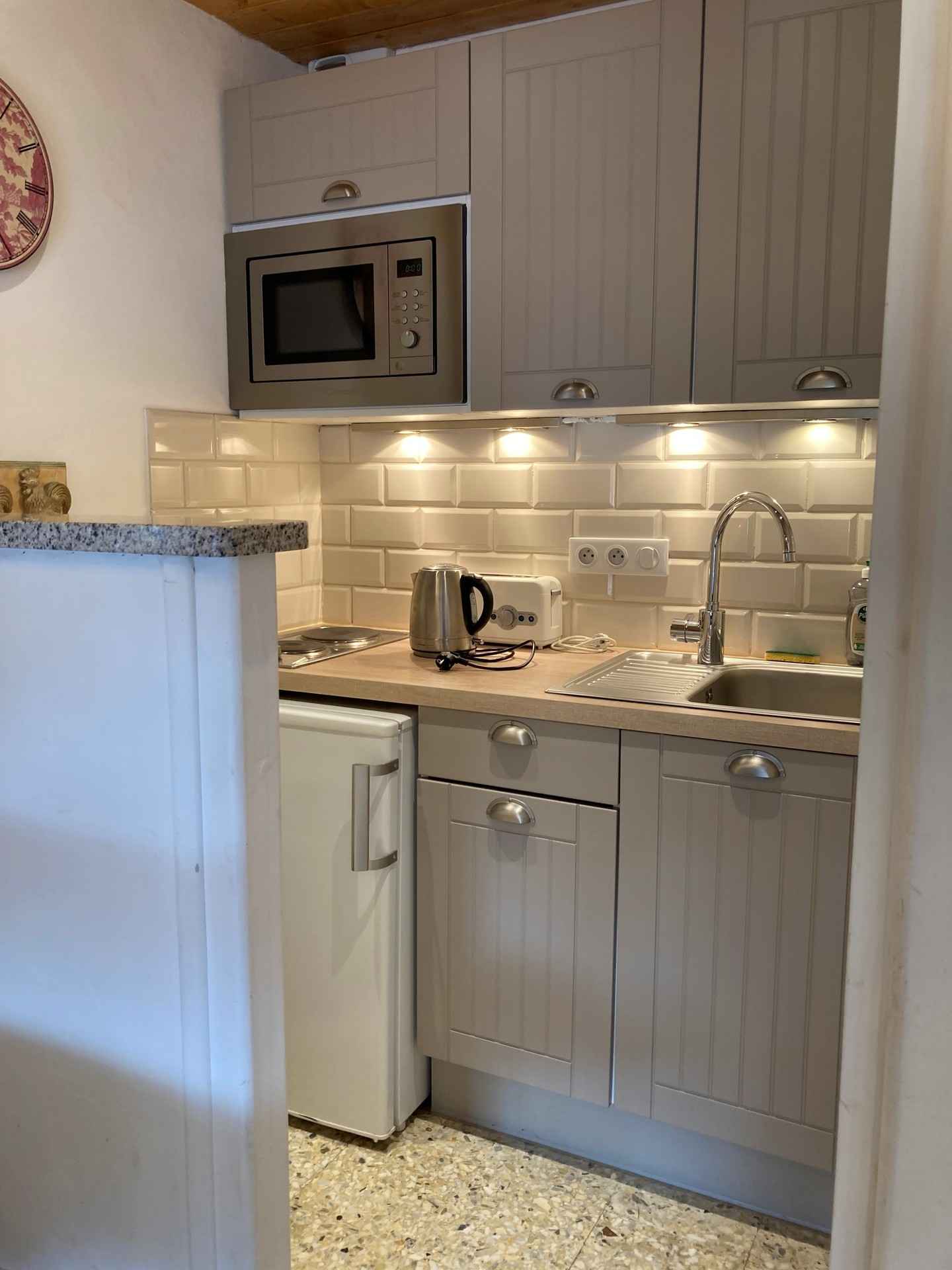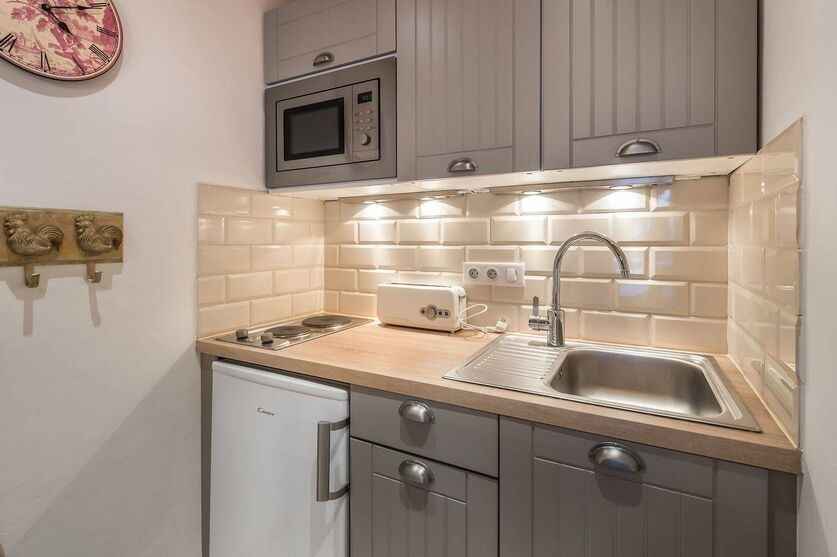 coin cuisine équipé avec plaques électriques (2 feux), micro-ondes grill, cafetière italienne à piston et cafetière électrique à filtre, grille-pain, bouilloire et réfrigérateur.