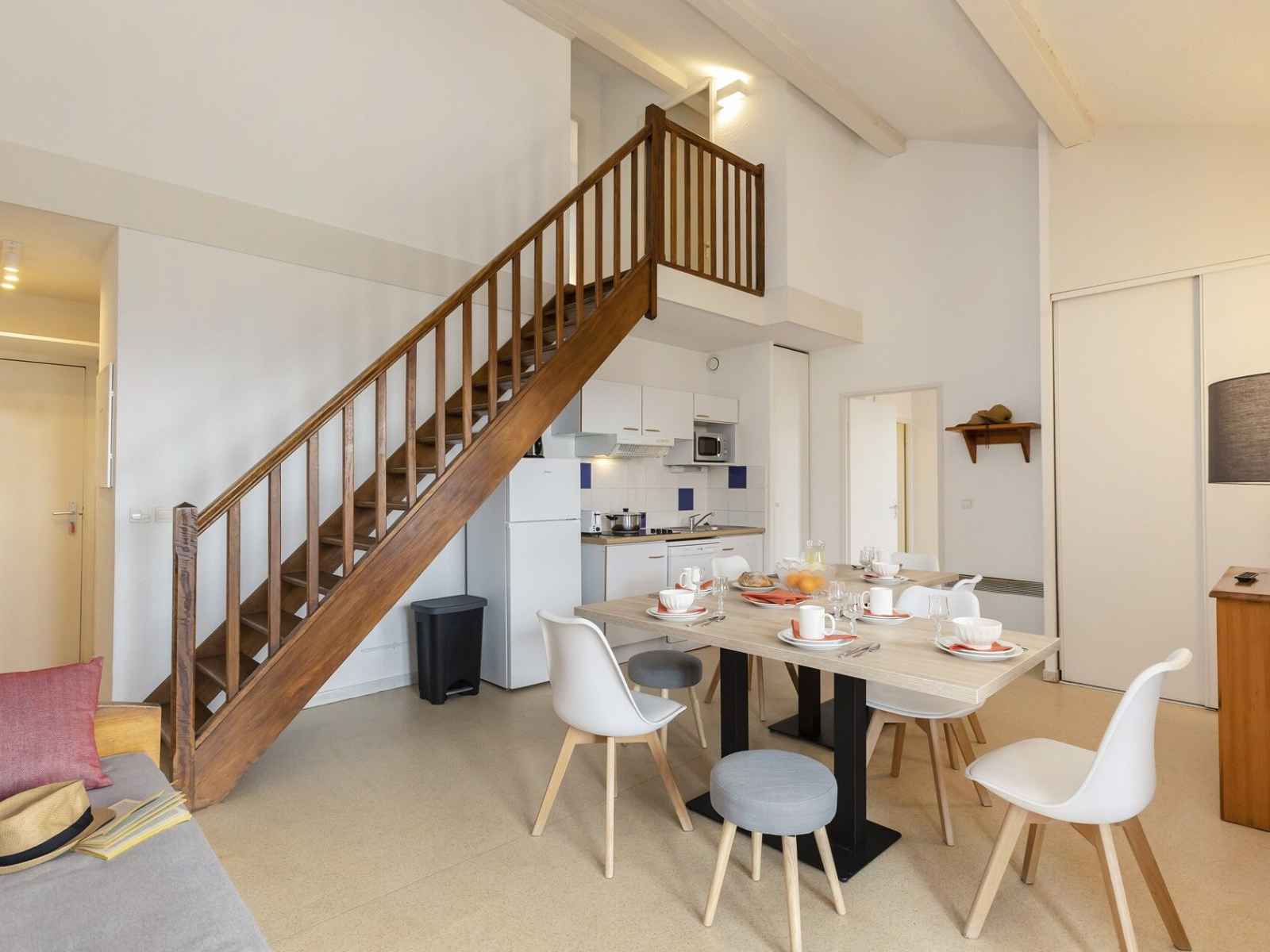 kitchenette équipée (réfrigérateur, plaque vitrocéramique, combiné gril/micro-ondes, lave-vaisselle, hotte aspirante, cafetière électrique, bouilloire électrique, grille-pain)