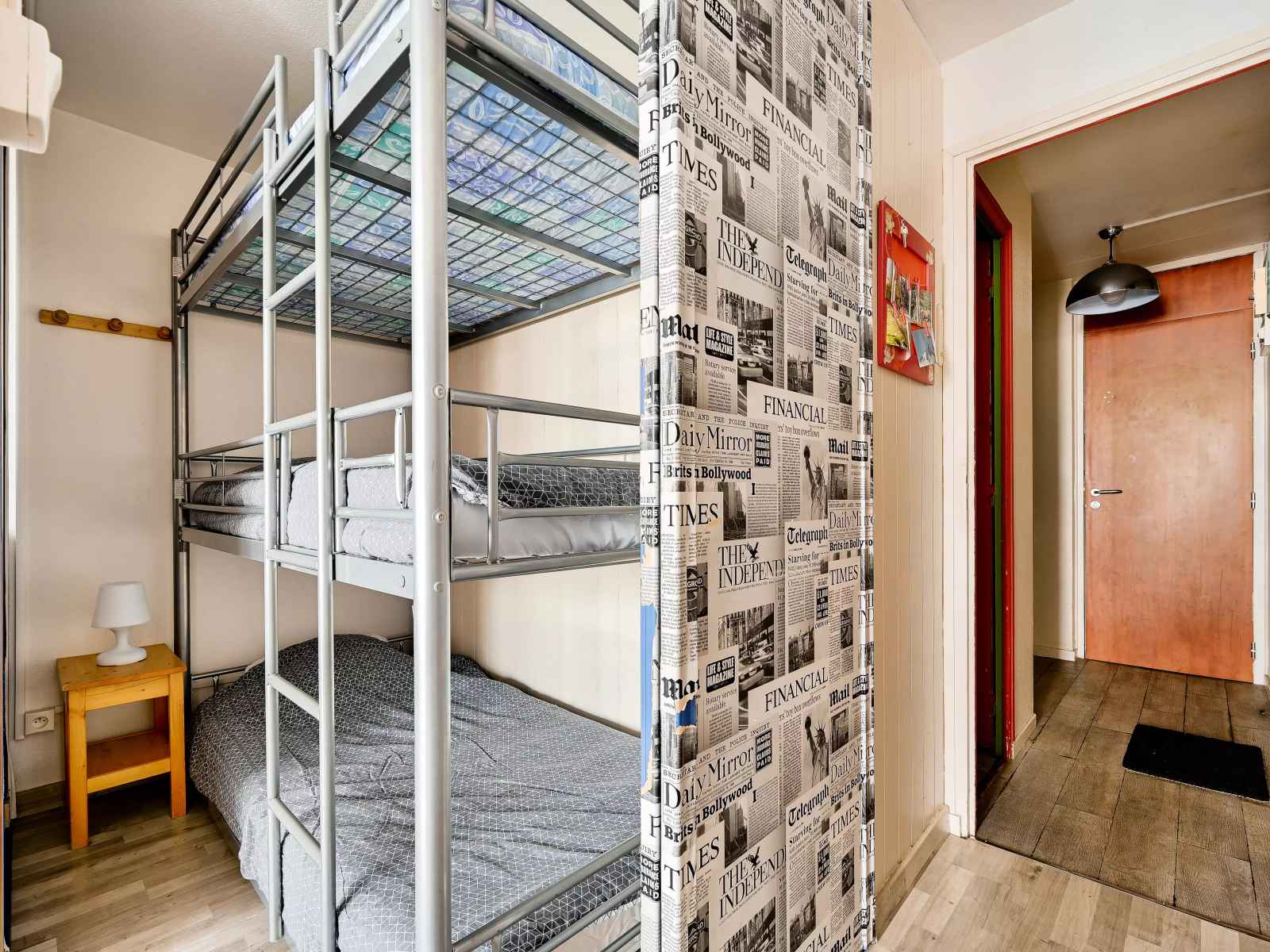 composition du séjour : 1 canapé-lit (2 couchages) et 1 méridienne. 1 coin cabine (fermé par porte coulissante) avec 3 lits simples superposés. côté