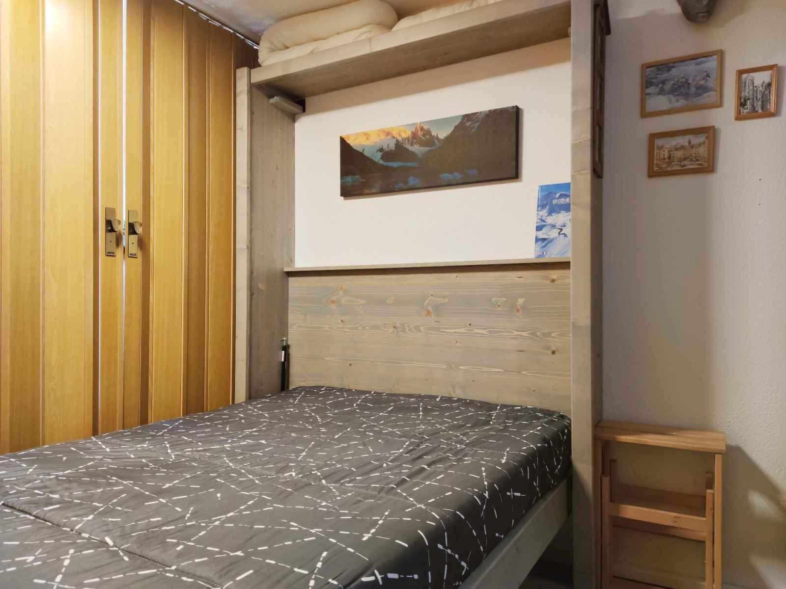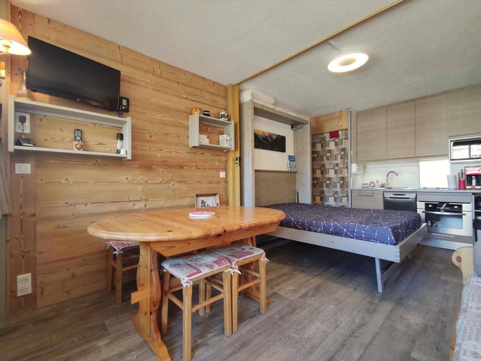 1 four micro-ondes. Le séjour, divisible par une cloison coulissante, est composé d’un lit double rabattable et d'un lit gigogne (utilisable en lit double 160cm ou 2 lits simples). TV écran plat, WiFi inclus et gratuit. Le studio est équipé de couettes La salle de bain se compose d’un lavabo, cabine de douche et WC. Pour votre information, le linge de lit est non fourni. Côté pratique, 1 casier à skis est à disposition. Animaux non admis