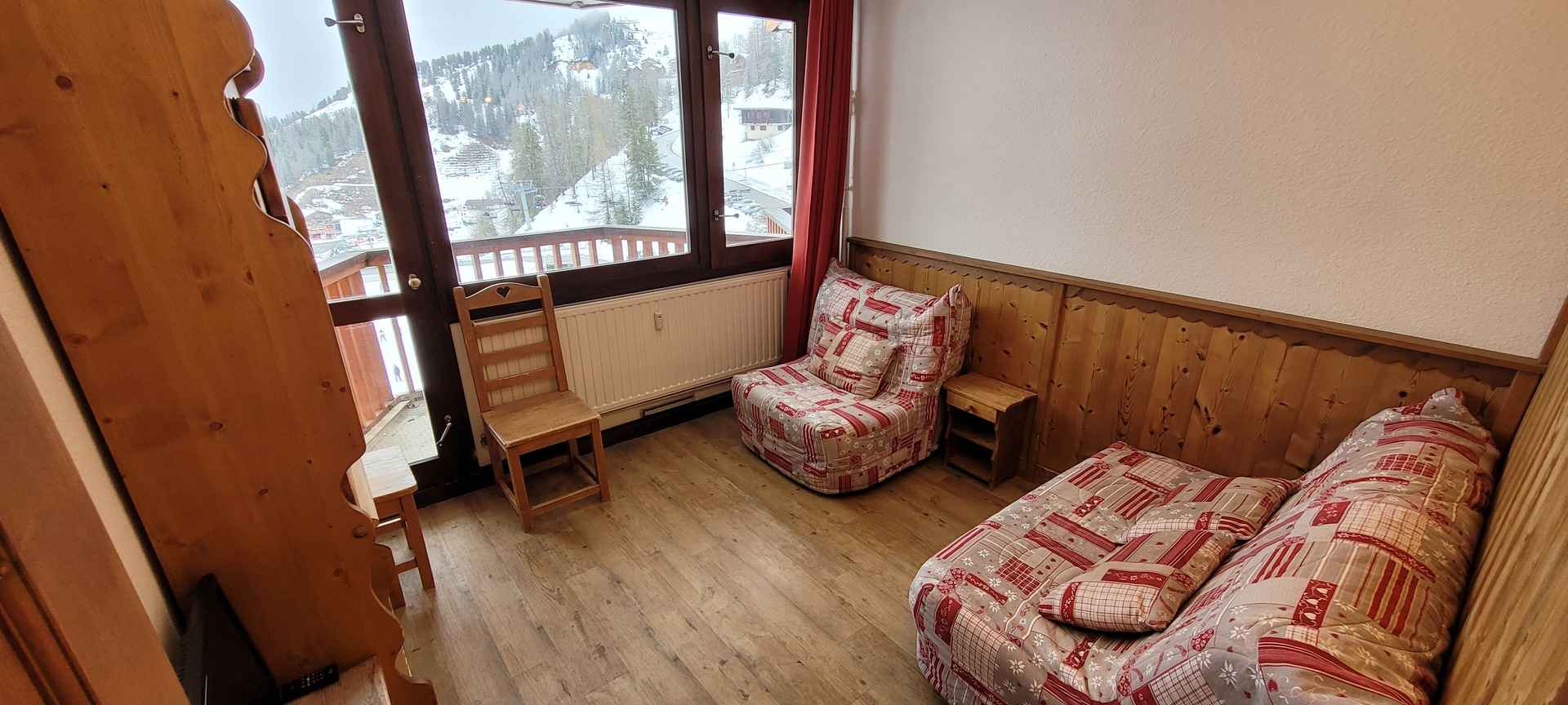 Situé dans la résidence le france, au pied des pistes de plagne centre. studio type confort de 16m² pour 2 personnes, rénové dans un style montagne moderne, avec balcon vue mont blanc.