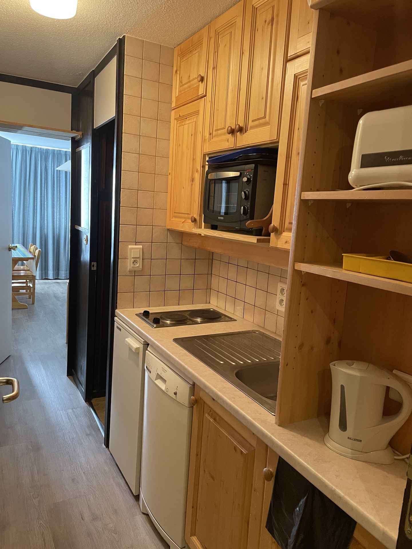 se compose d’une kitchenette comprenant 2 plaques électriques, 1 mini four, 1 micro ondes, 1 réfrigérateur, 1 cafetière filtre, 1 cafetière Nespresso Krups et 1 lave-vaisselle. L'appartement dispose d'un appareil à raclette et à fondue Le séjour est composé de 4 couchages, 2 lits banquettes + lit gigogne associé pouvant être modulés en 4 lits simples ou 2 lits doubles en 160. Equipé de couettes 1 téléviseur écran plat. La salle de bain se compose d’un lavabo, baignoire et WC. Pour le côté pratique, 1 casier à ski est à disposition. Pour votre information, les animaux ne sont pas admis, le linge de lit et le ménage de fin de séjour ne sont pas compris.
