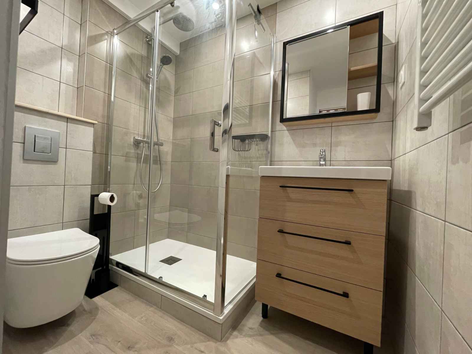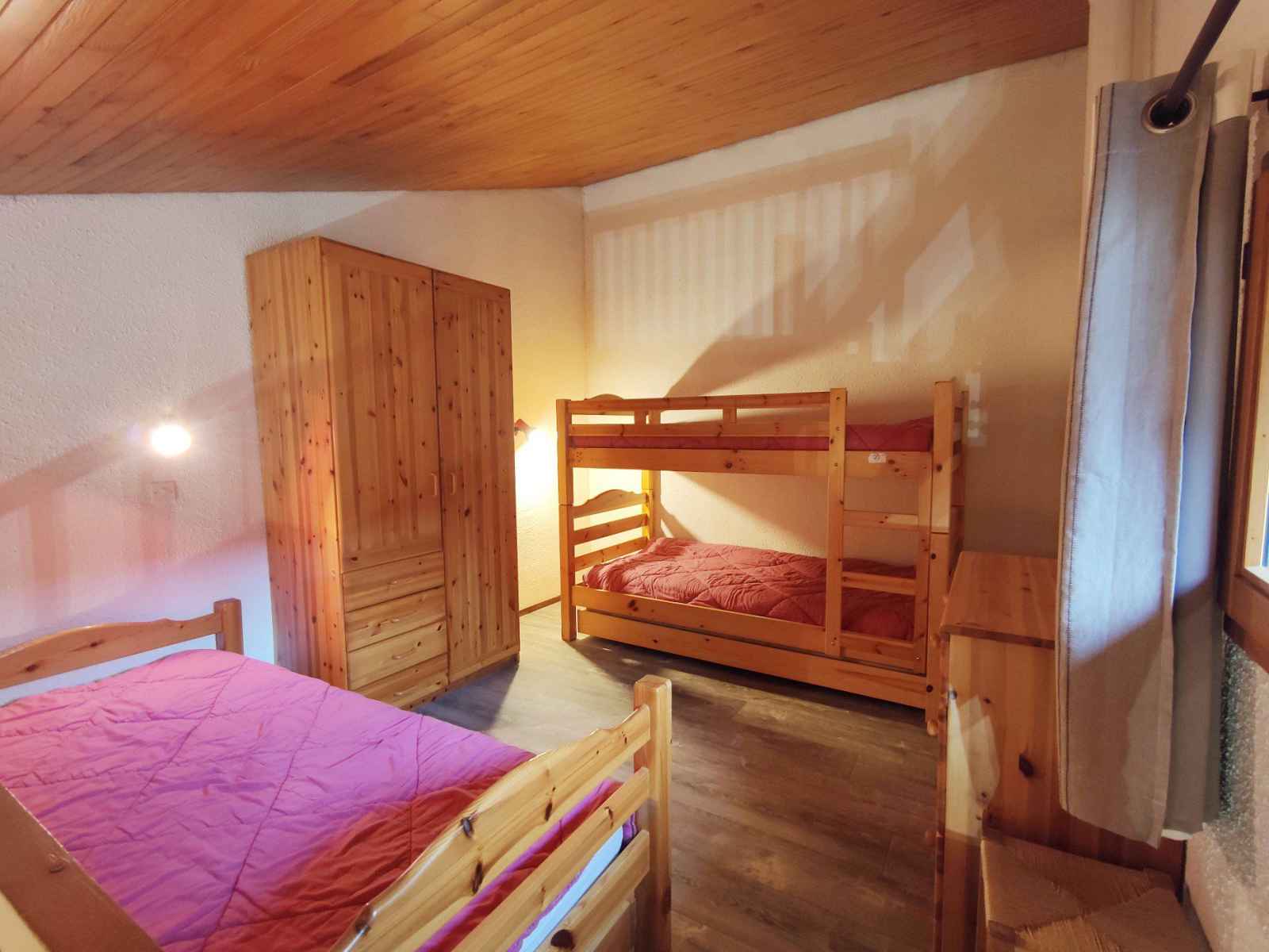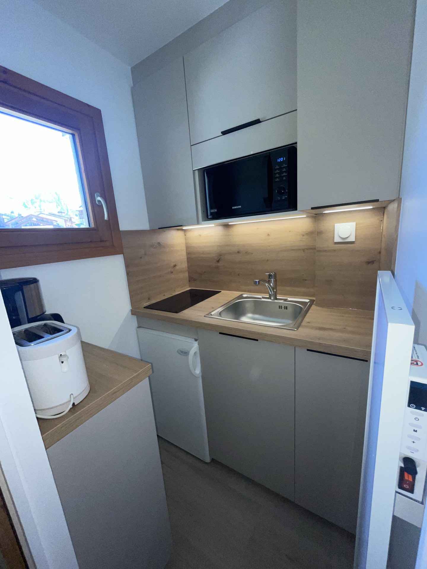 séparée et équipée d'1 plaque vitrocéramique 2 feux, 1 micro-ondes et 1 réfrigérateur. Le séjour, est composé d’un canapé lit de 2 personnes 160 (nouvelle literie 2025) et une T.V. écran plat. Le studio est équipé de couettes La mezzanine est ouverte sur le séjour et est équipée de 2 lits superposés et 1 lit simple. La salle de bain se compose d’un lavabo, d’une douche et W.C. (rénovée) Pour votre information, le linge de lit est non fourni. Côté pratique, 1 casier à skis est à disposition. Animaux non admis