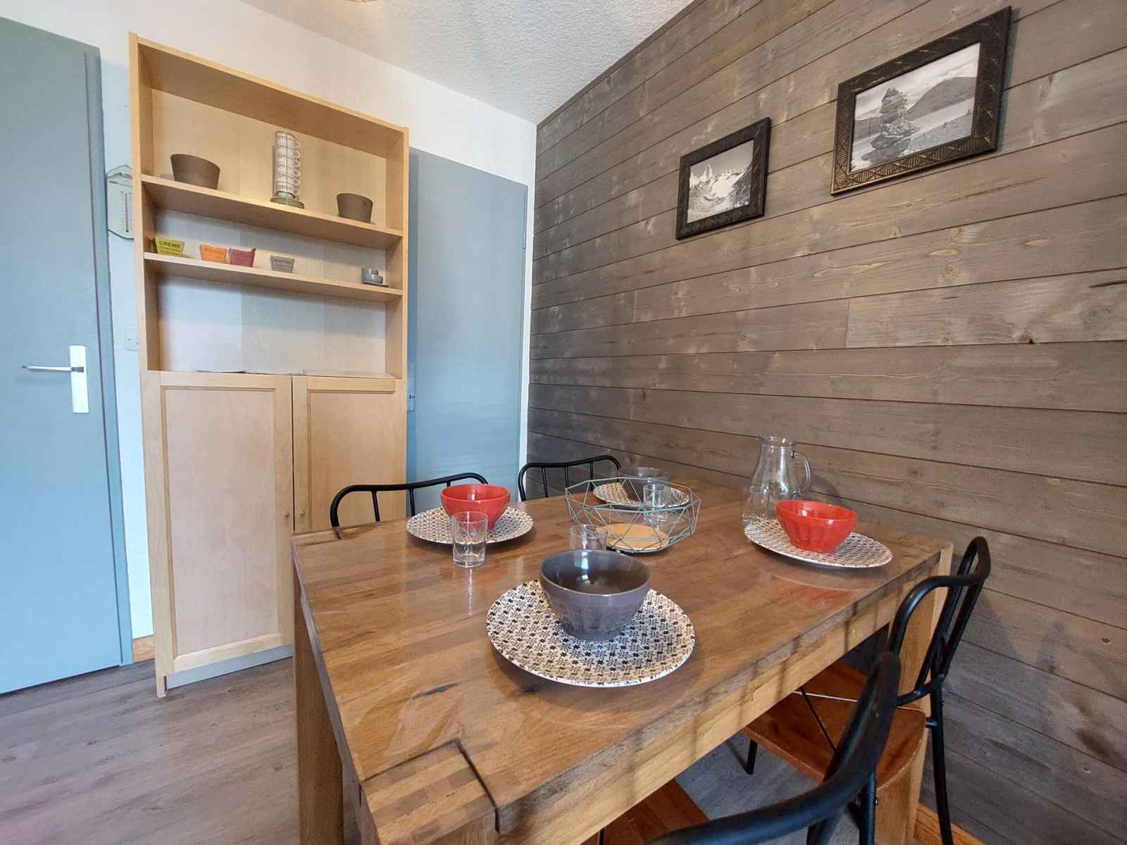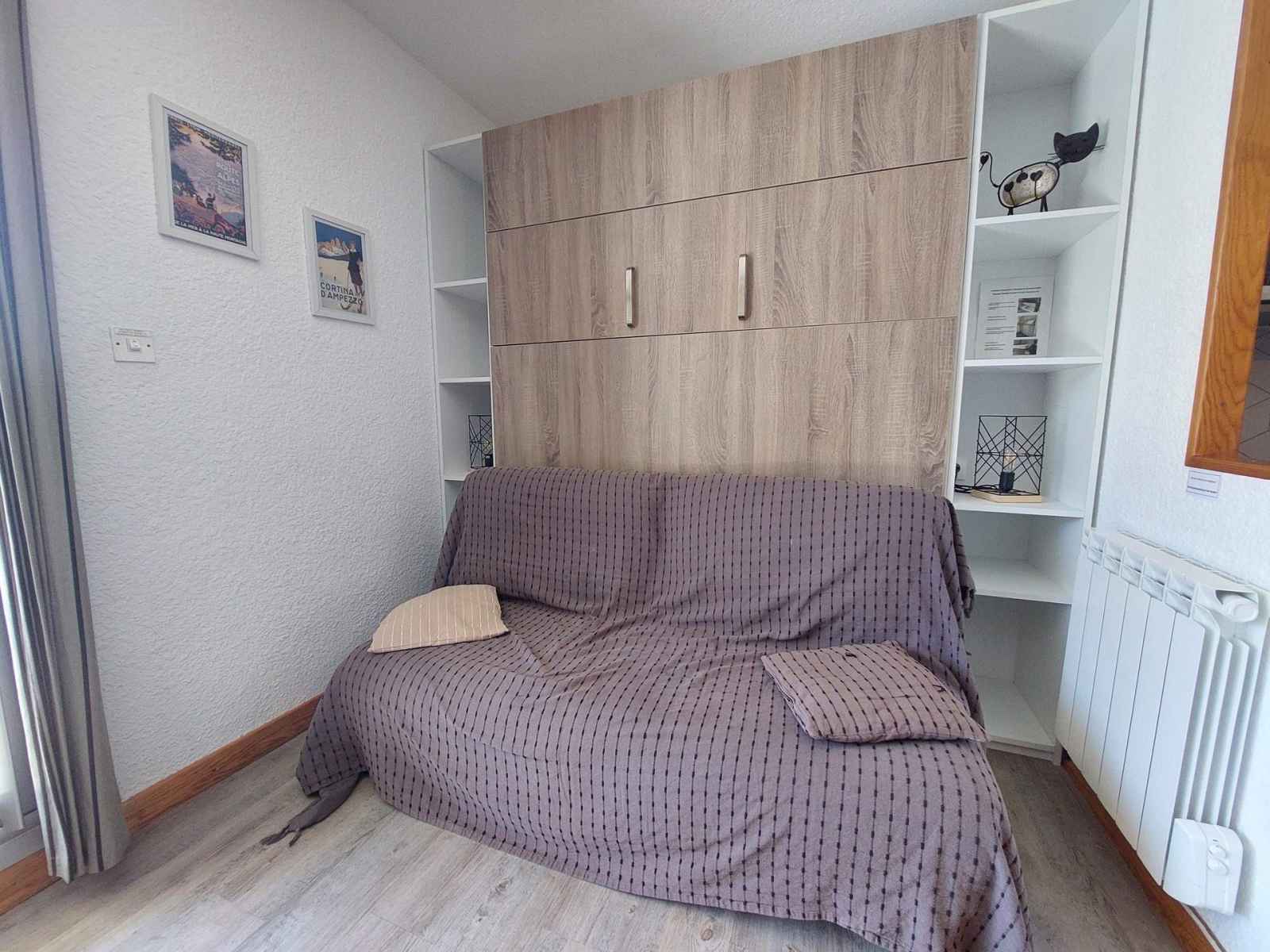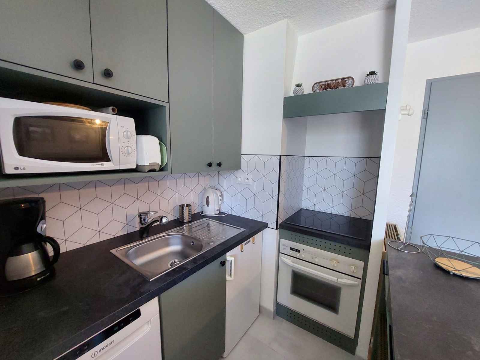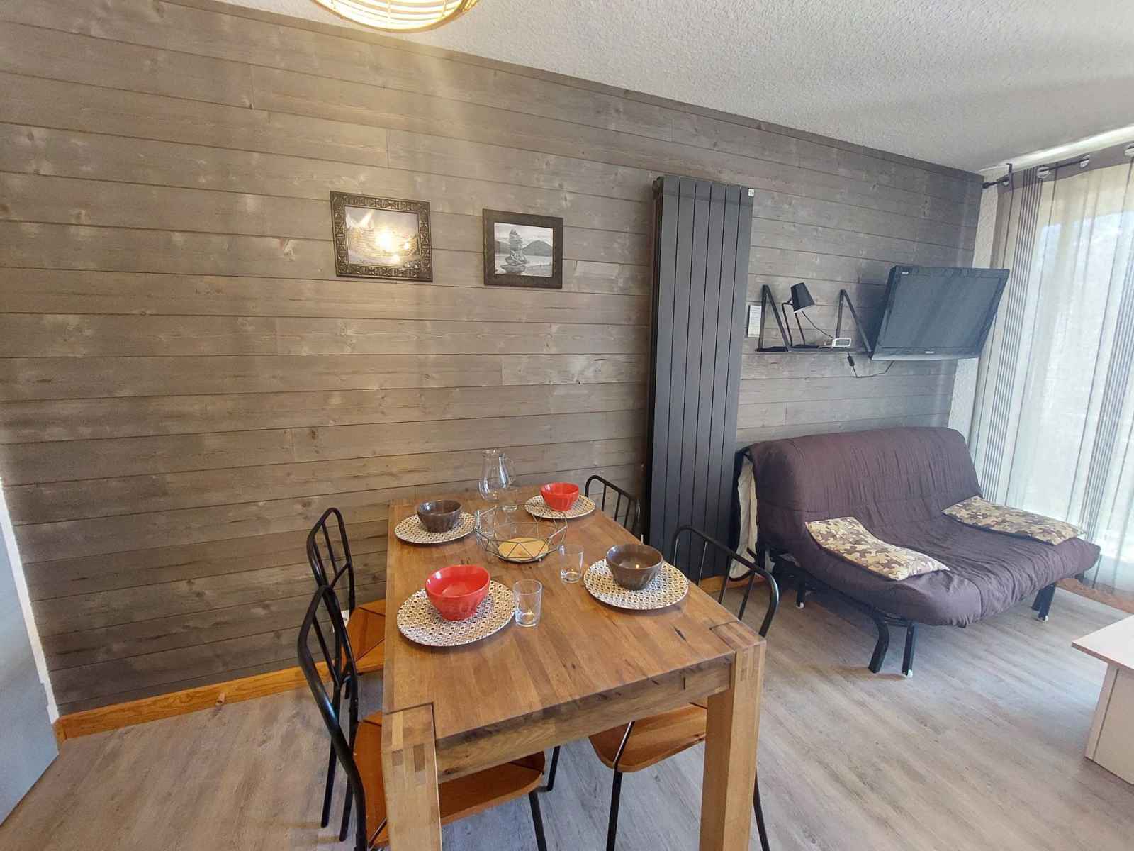 four + 3 plaques vitrocéramiques, micro-onde, réfrigérateur, lave-vaisselle, cafetière, bouilloire, grille-pain, appareil à raclette. Couchages : - Séjour : 1 lit double escamotable - Coin nuit : 2 lits simples superposés Couchage supérieur déconseillé aux – de 6 ans Le coin nuit est situé dans le couloir séparé du salon par une porte. Sanitaires : Salle de bain avec cabine de douche WC séparés. Divers : Casier à ski Accès au parking collectif de l'immeuble, place non garantie Animaux refusés Le linge de lit, le linge de maison, les serviettes, le wifi ainsi que le ménage de fin de séjour ne sont pas inclus (à réserver au plus tard le jour de votre arrivée et sous réserve de disponibilité).