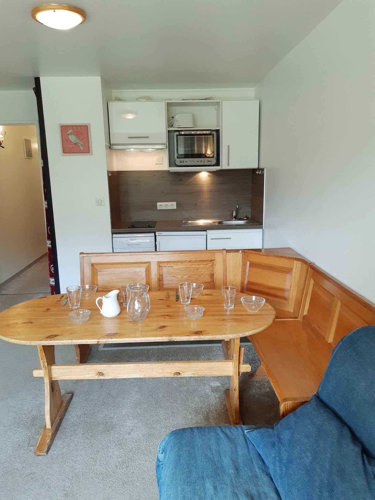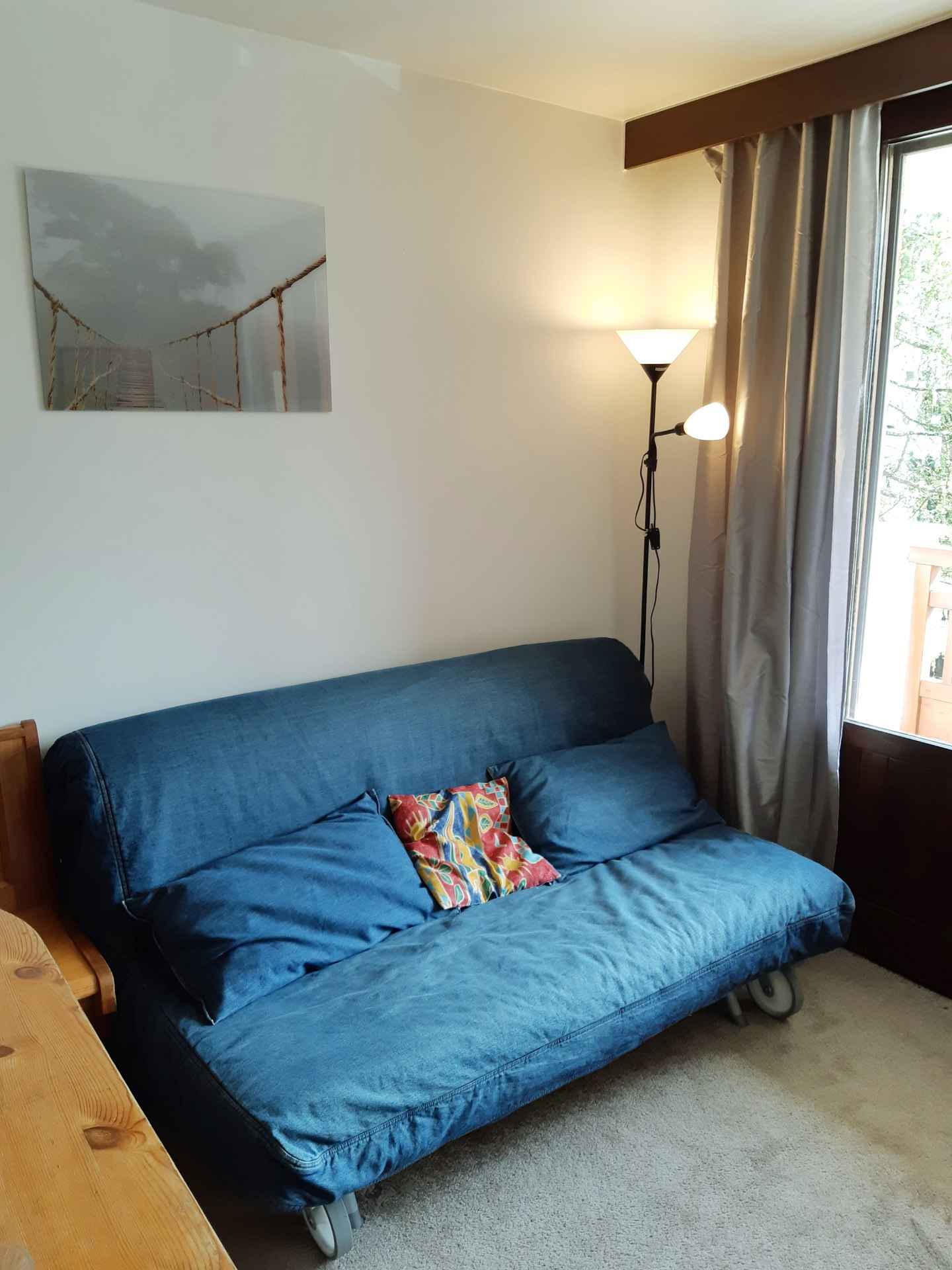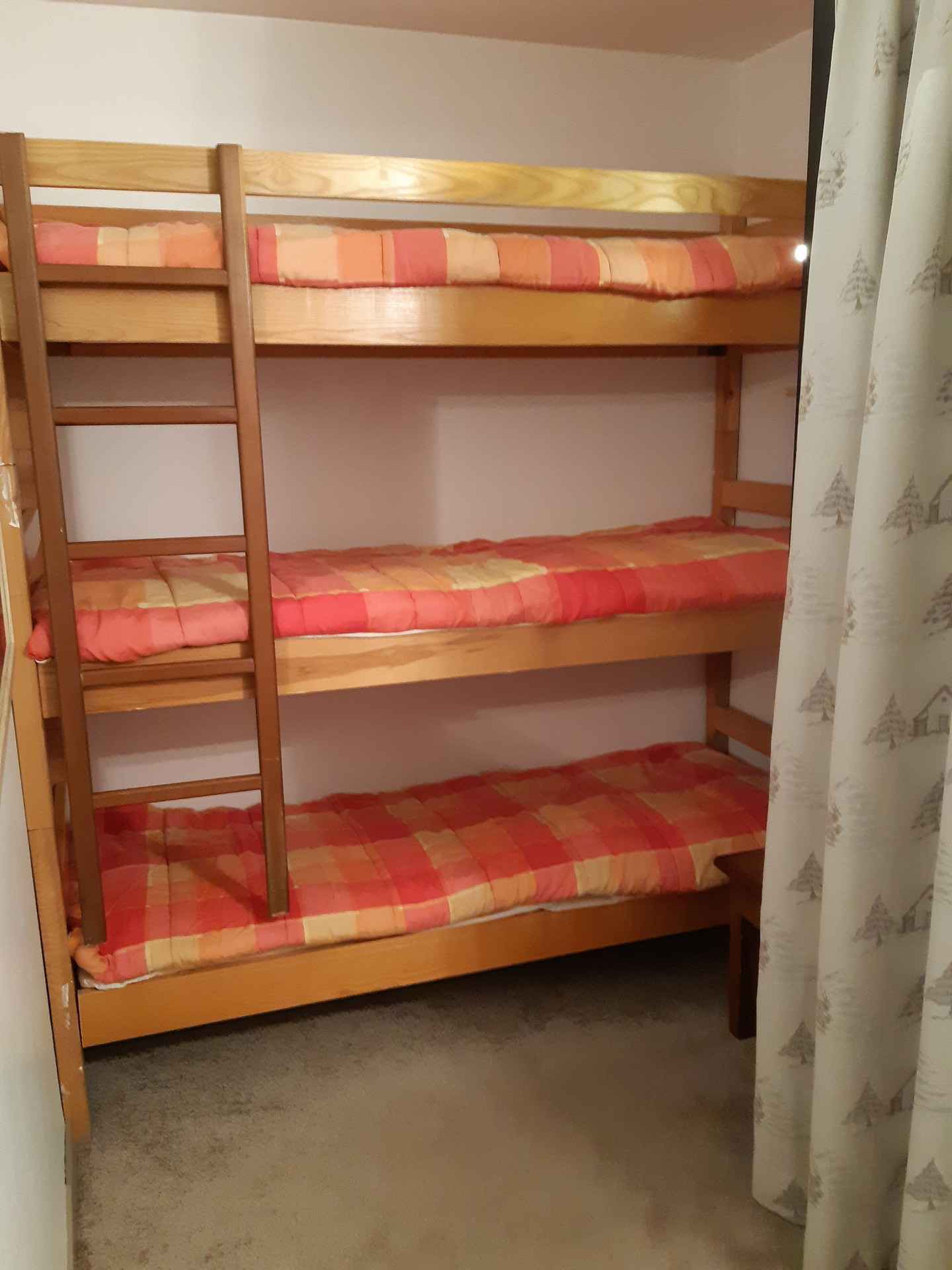 réfrigérateur, lave-vaisselle, four, cafetière, bouilloire, grille-pain, appareil à raclette. Couchages : - Séjour : 1 canapé BZ (lit double : 160x200) - Coin nuit : 3 lits simples superposés (80x190) Couchage supérieur déconseillé aux – de 6 ans Le coin nuit est situé dans le couloir séparé du salon par une porte. Sanitaires : Salle de bain avec baignoire WC séparés. Divers : Casier à ski Animaux interdits Volet roulant électrique Le linge de lit, le linge de maison, les serviettes ainsi que le ménage de fin de séjour ne sont pas inclus (à réserver au plus tard le jour de votre arrivée et sous réserve de disponibilité).