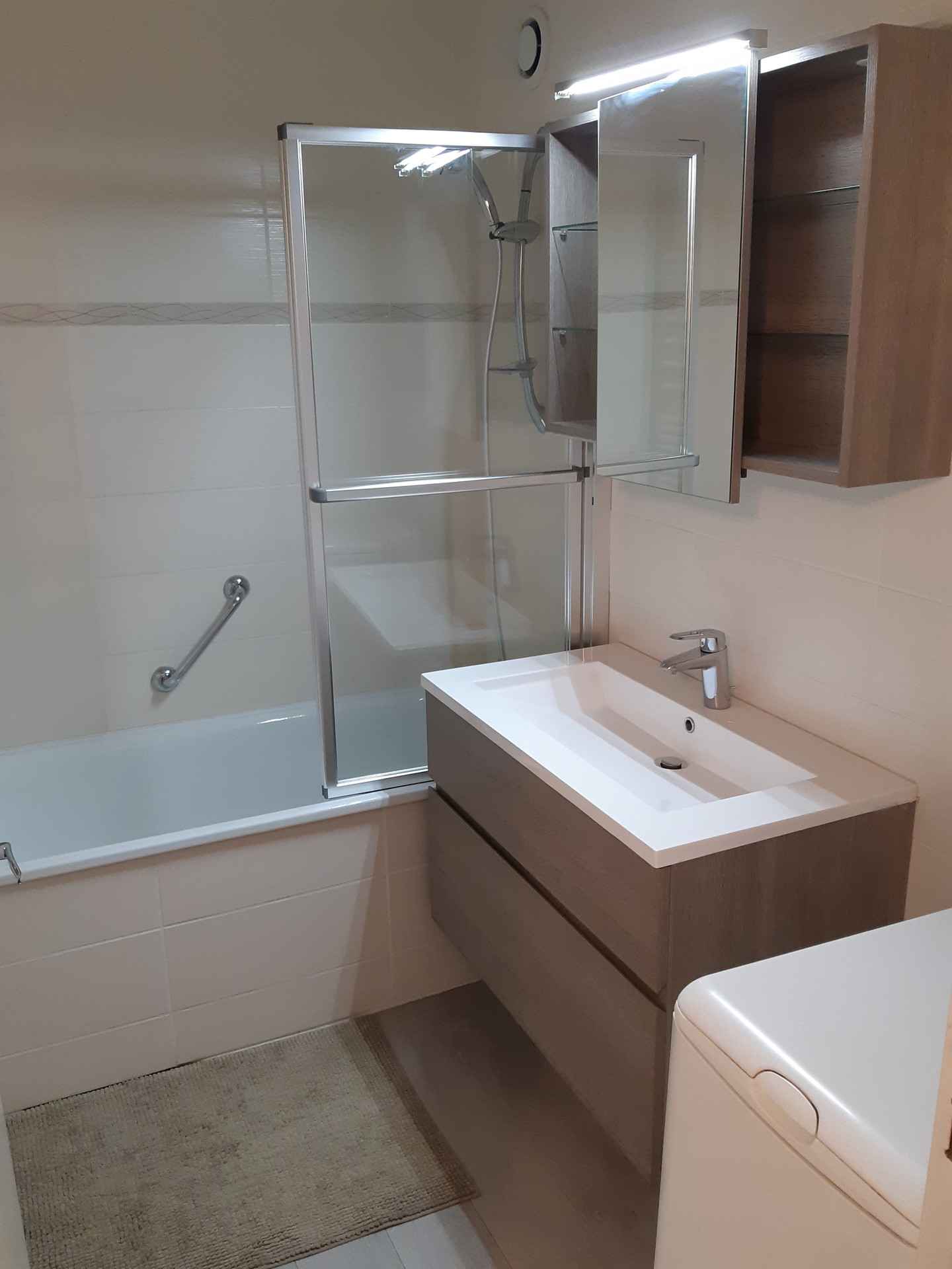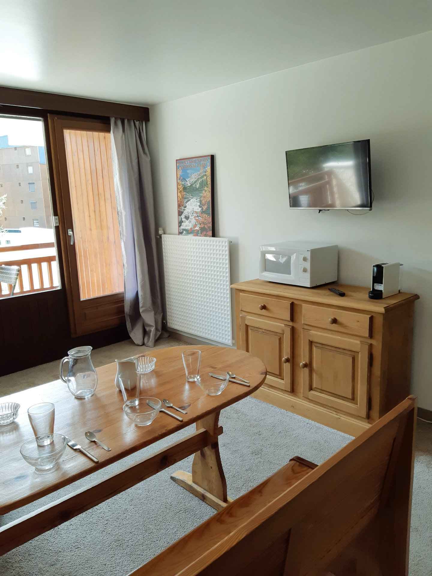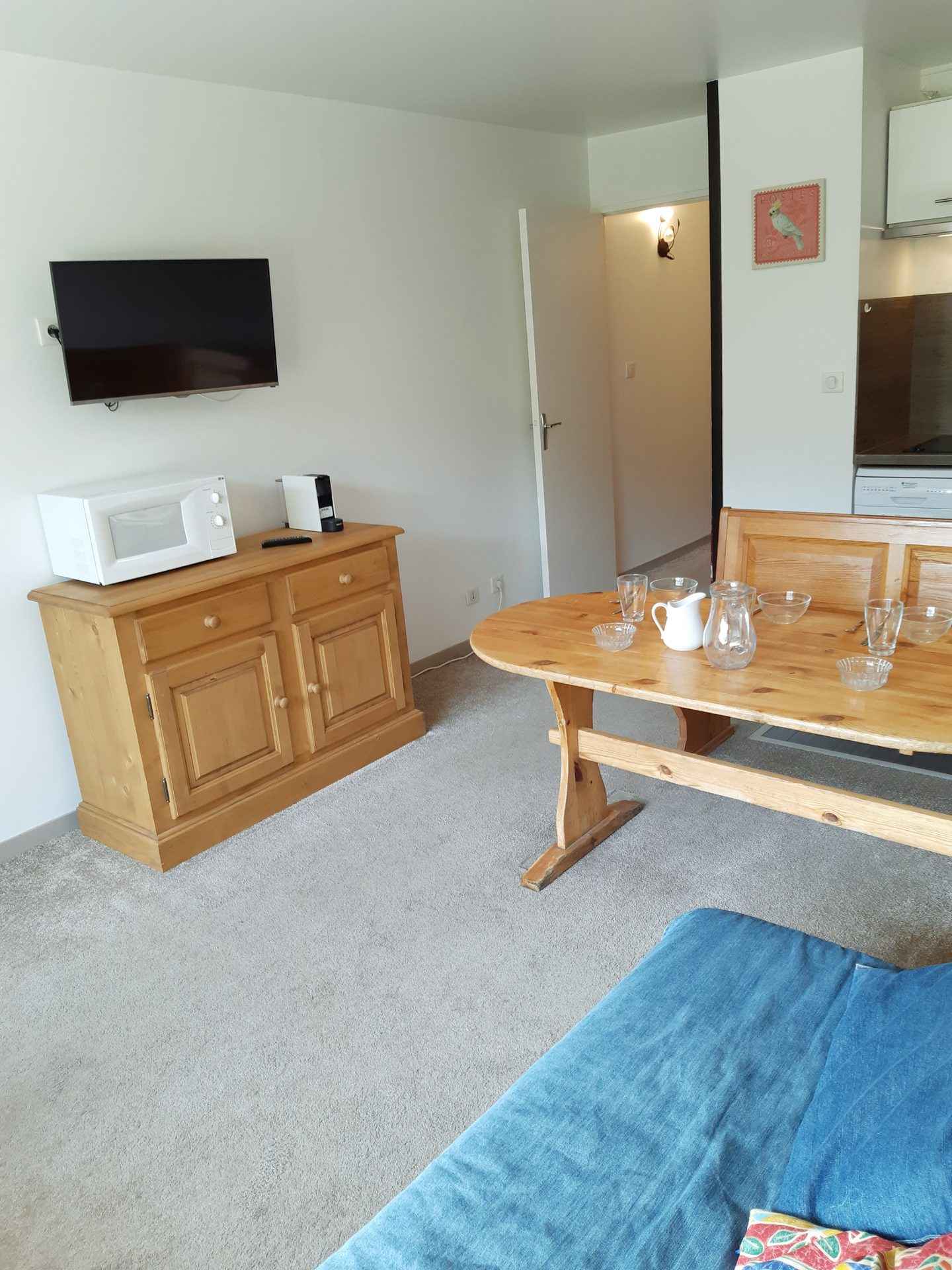 réfrigérateur, lave-vaisselle, four, cafetière, bouilloire, grille-pain, appareil à raclette. Couchages : - Séjour : 1 canapé BZ (lit double : 160x200) - Coin nuit : 3 lits simples superposés (80x190) Couchage supérieur déconseillé aux – de 6 ans Le coin nuit est situé dans le couloir séparé du salon par une porte. Sanitaires : Salle de bain avec baignoire WC séparés. Divers : Casier à ski Animaux interdits Volet roulant électrique Le linge de lit, le linge de maison, les serviettes ainsi que le ménage de fin de séjour ne sont pas inclus (à réserver au plus tard le jour de votre arrivée et sous réserve de disponibilité).