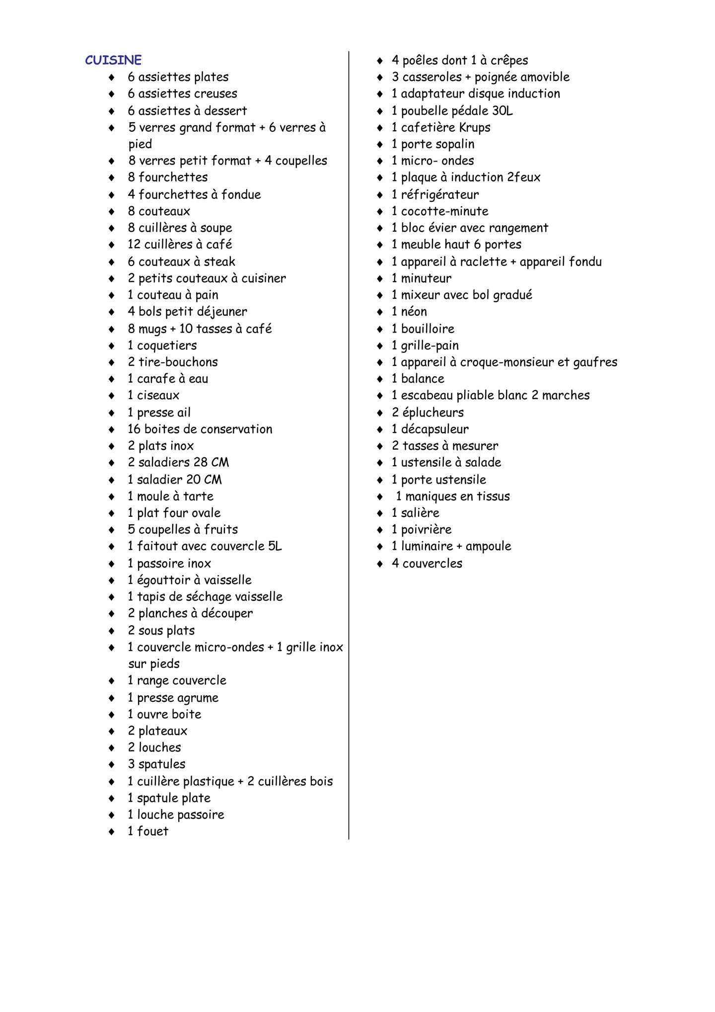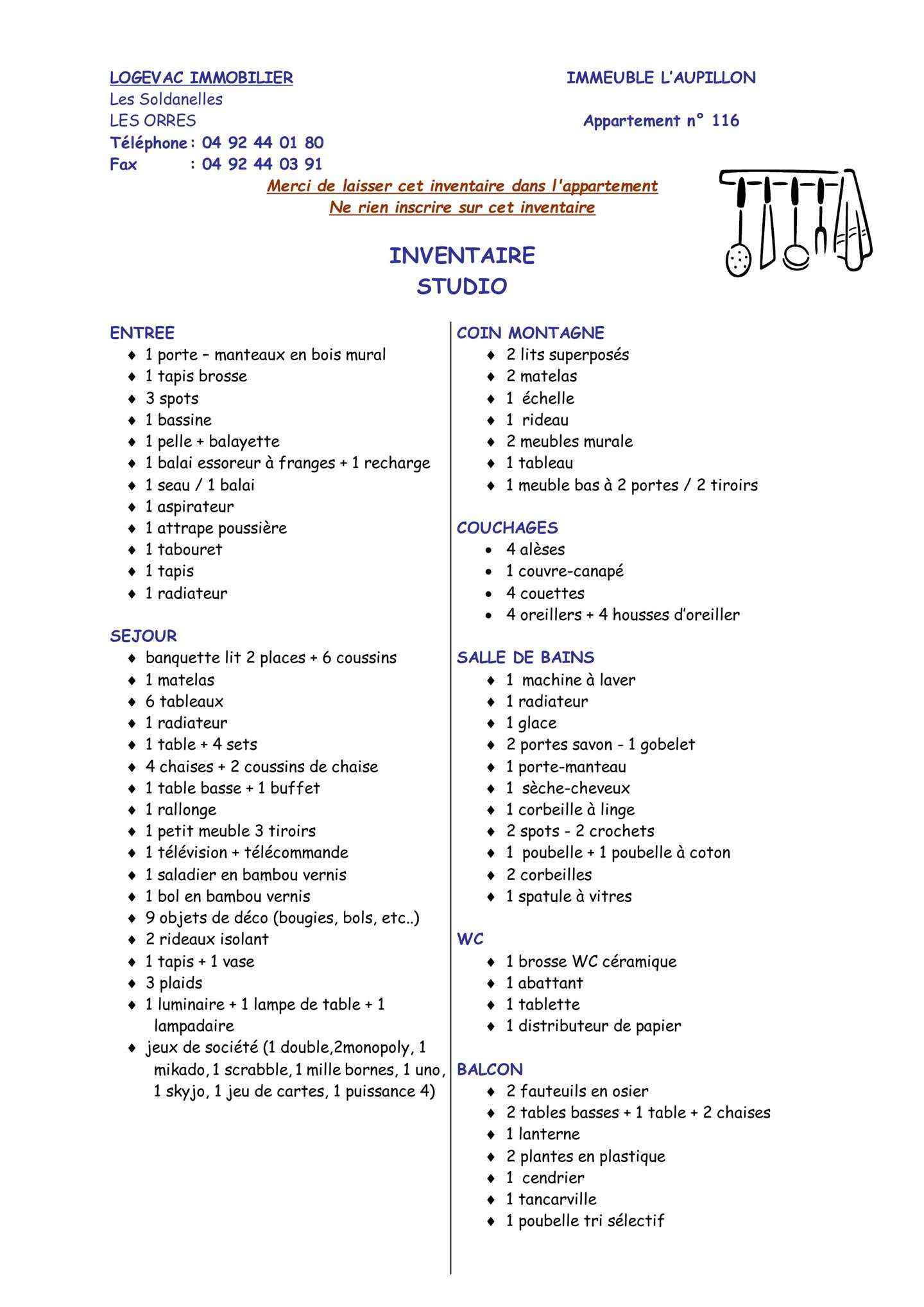 • Equipements : Balcon, Chauffage Electrique, Lave linge, Micro-onde, Parquet, réfrigérateur, Télévision