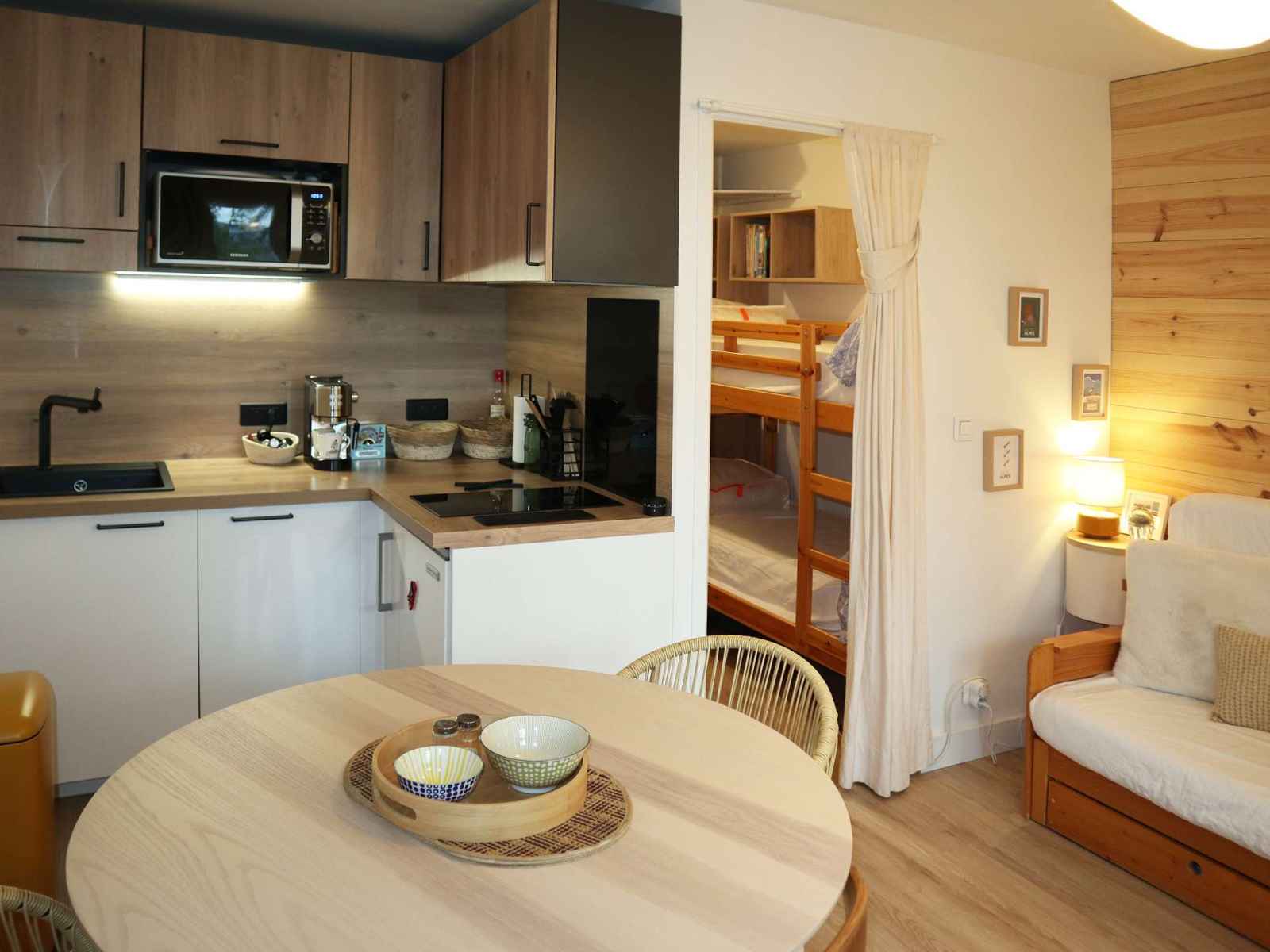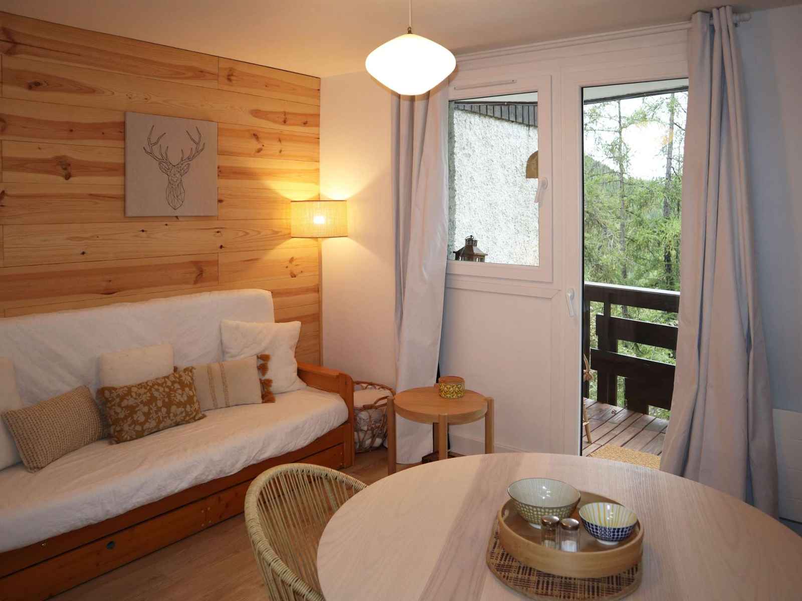 banquette convertible deux places, coin cuisine ouvert sur le séjour, grand balcon en exposition nord-ouest, vue sur la montagne, box à skis.