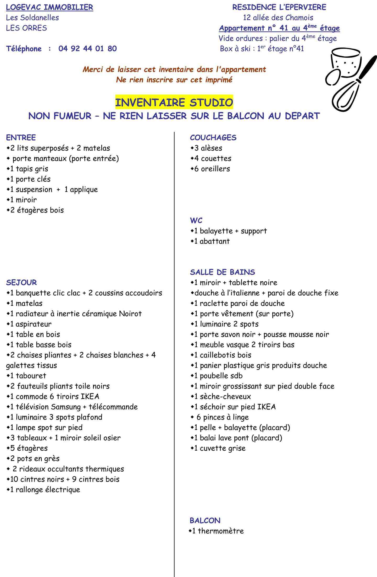 • Equipements : Box à Skis, Chauffage Electrique, Micro onde, Moquette, Télévision