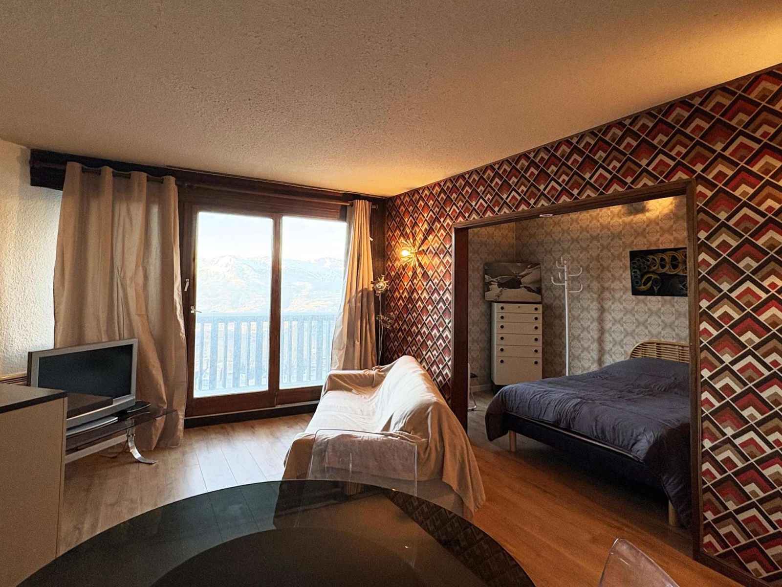 Studio pour deux personnes situé en cœur de station dans une résidence de prestige avec accès solarium, salon télévision, coin wifi, billard et coin cheminée, comprenant, une entrée, un séjour avec une banquette convertible deux personnes, un coin cuisine équipé et une salle d'eau avec wc. balcon exposition est. au sixième étage de la