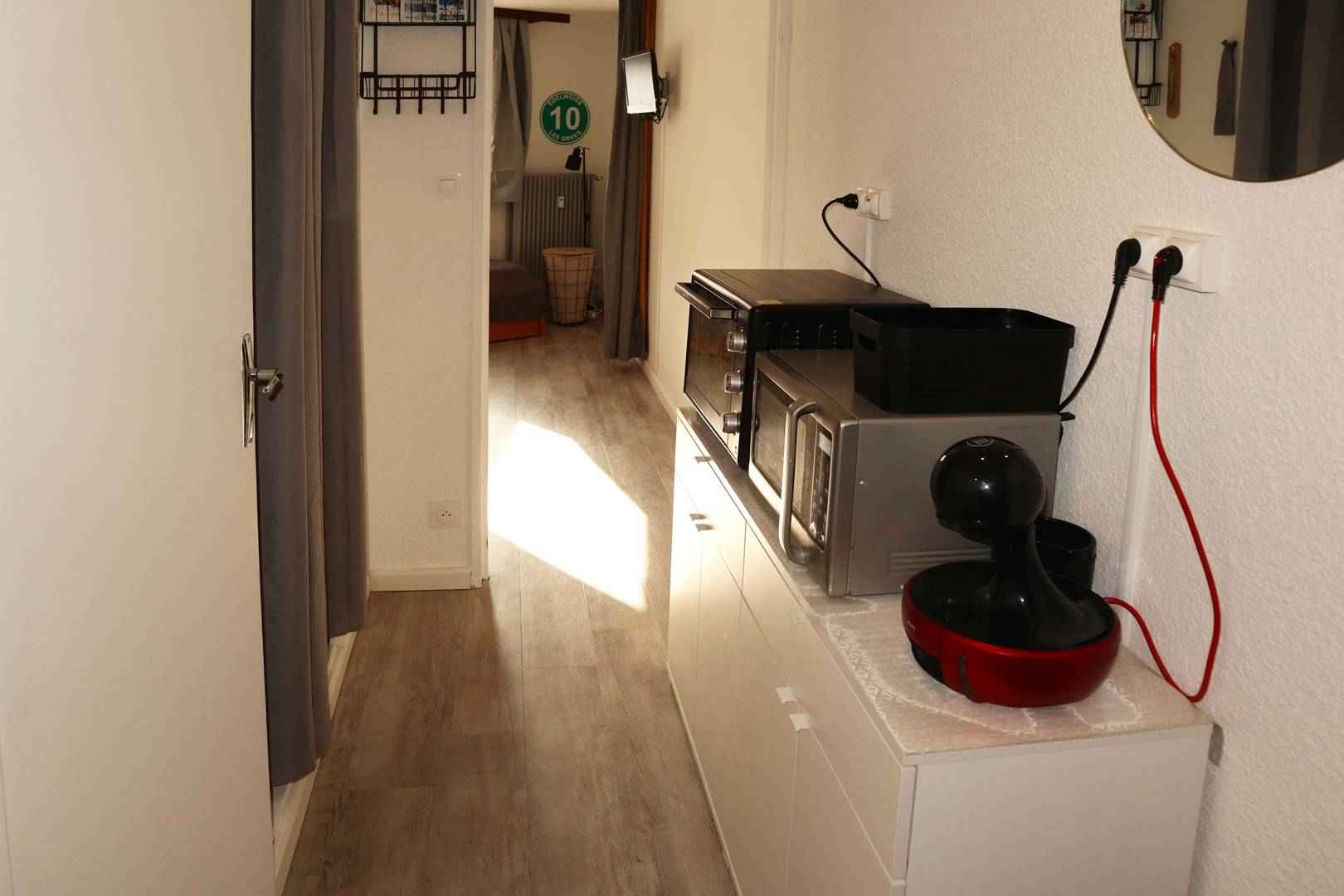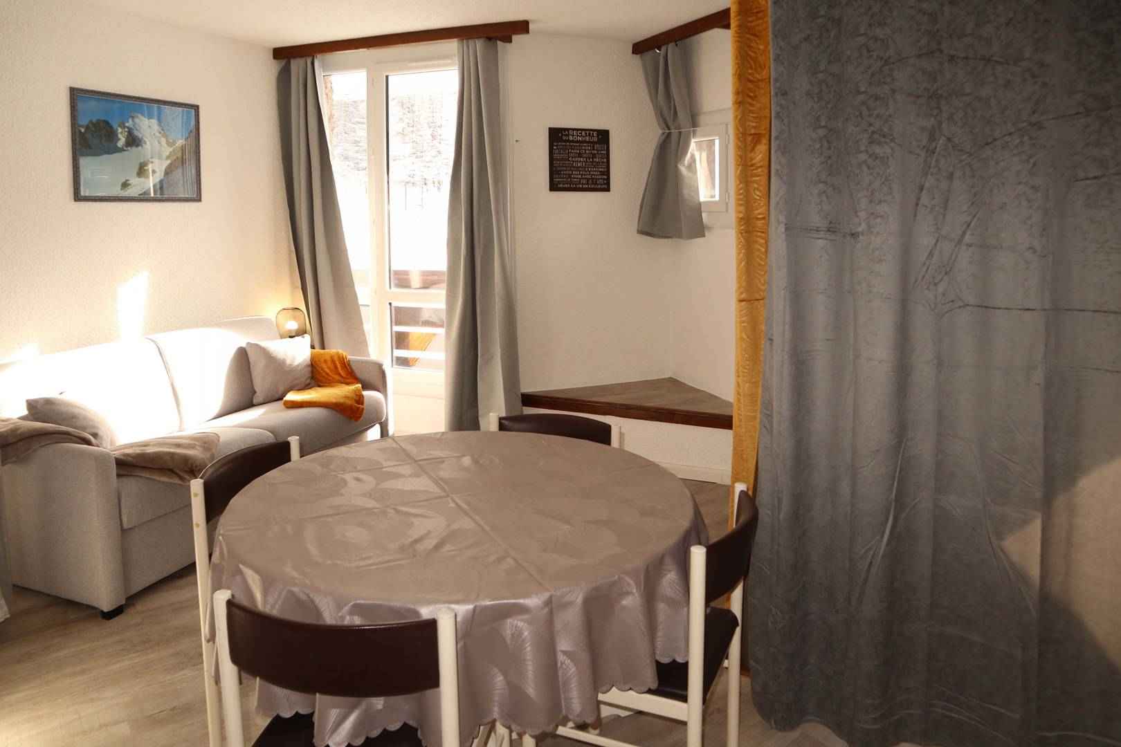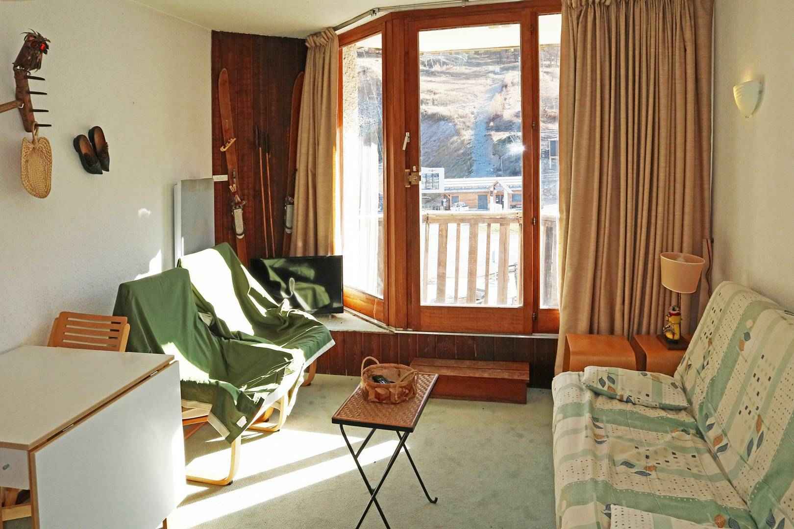 Dans la résidence le boussolenc, au dessus de la galerie commerciale, départ skis aux pieds. coquet studio aménagé pour 4 personnes au 5ème étage avec ascenseur, comprenant une entrée, un séjour avec 1 banquette convertible clic-clac 2 places et 2 lits gigognes 1 place, une salle d'eau avec wc, un coin cuisine, balcon offrant une très