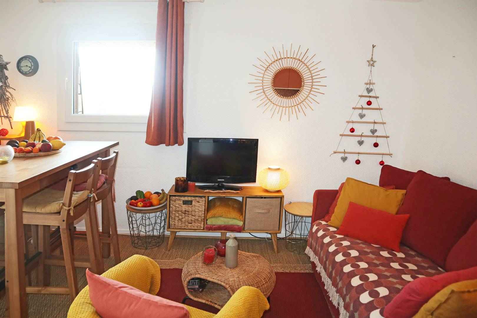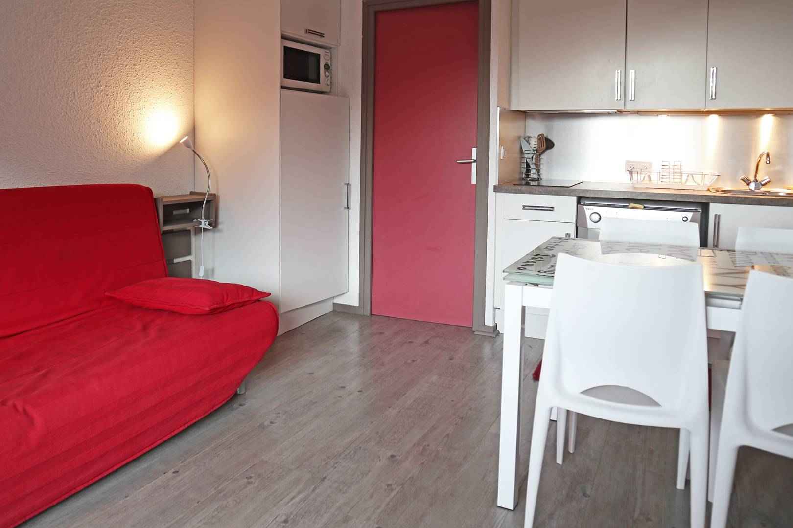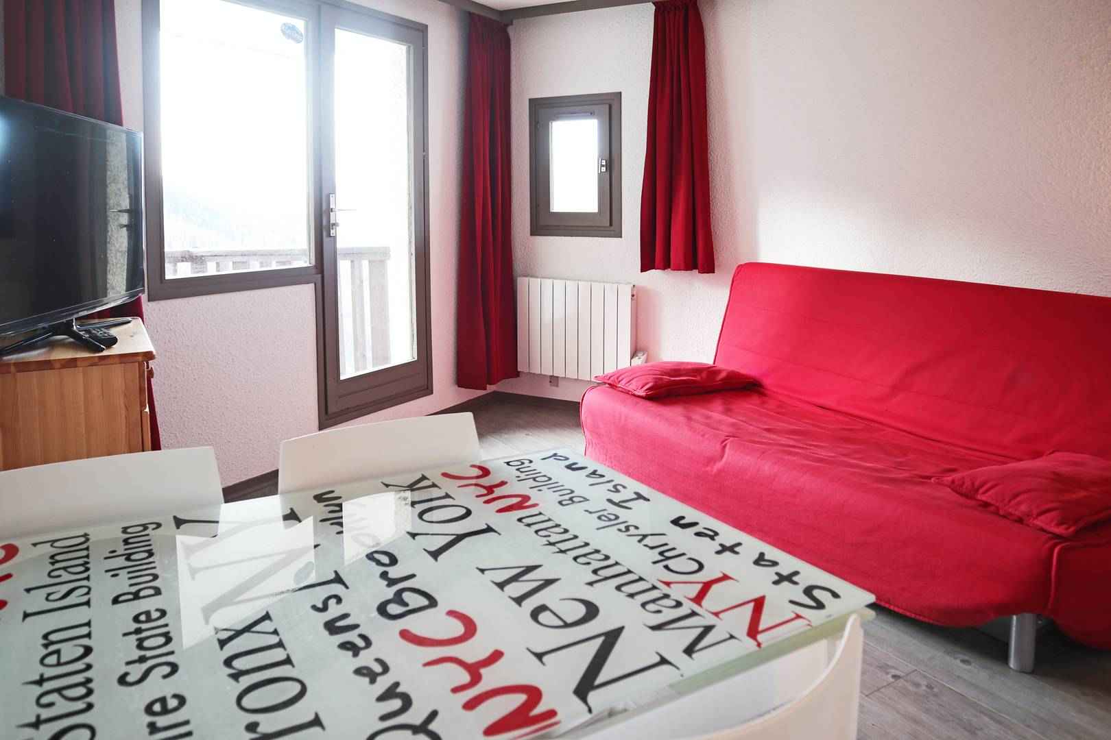 En cœur de station, départ skis aux pieds et accès direct aux commerces et aux animations, grand studio de bon confort équipé pour 6 personnes au 5 ème étage avec ascenseur, comprenant 2 coins montagne avec 2 lits superposés 1 place, un séjour avec 1 banquette convertible 2 places, un coin cuisine équipé et ouvert sur le séjour, salle