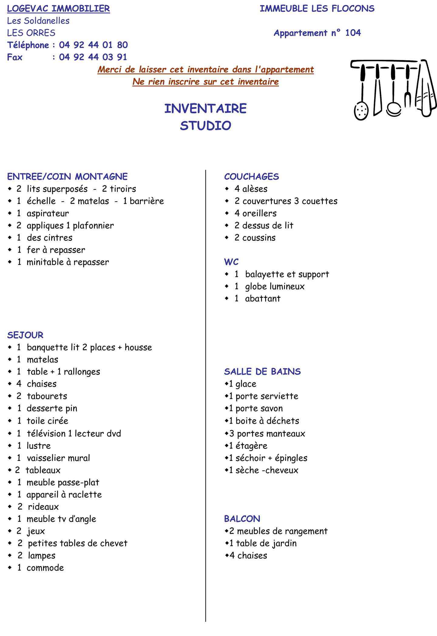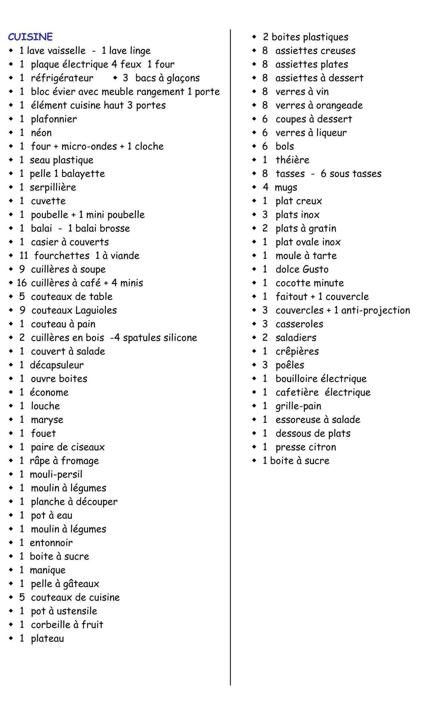 • Equipements : Balcon, Box à Skis, Chauffage Electrique, dvd, Four, Hotte aspirante, Lave linge, Lave vaisselle, Lino, Micro onde, réfrigérateur, Télévision