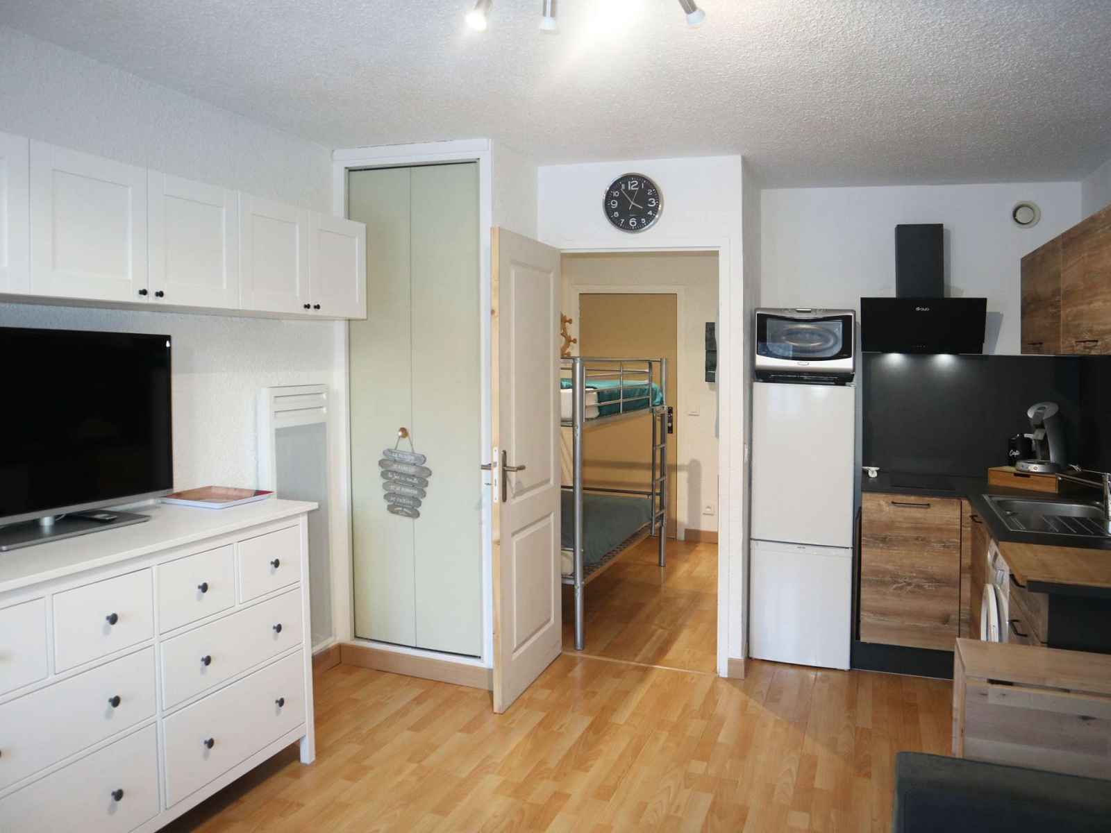 Très joli studio pour 4 personnes exposition est vue sur les pistes, 5 ème étage avec ascenseur entièrement refait à neuf, comprenant une entrée avec 2 lits superposés 1 place, un séjour avec 1 banquette convertible 2 places, un coin cuisine ouvert sur le séjour avec lave linge, une salle d'eau avec wc, balcon exposition est. idéalement