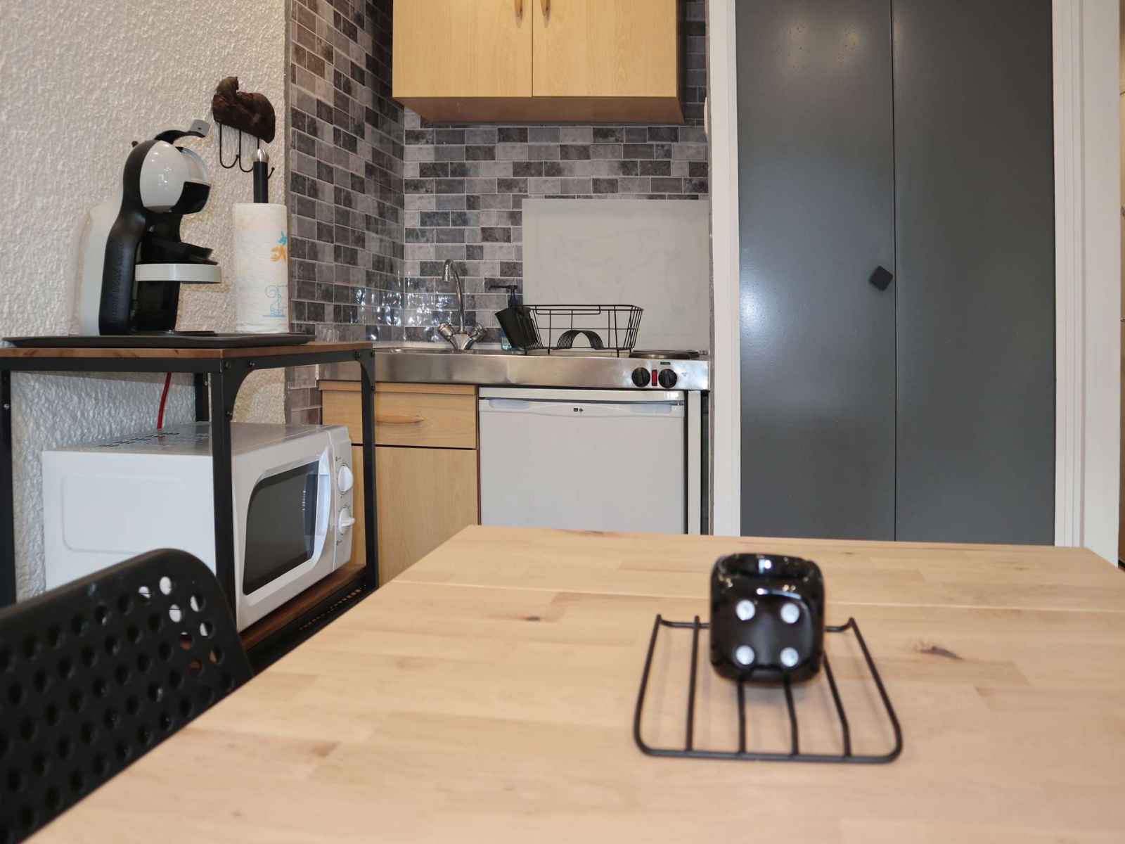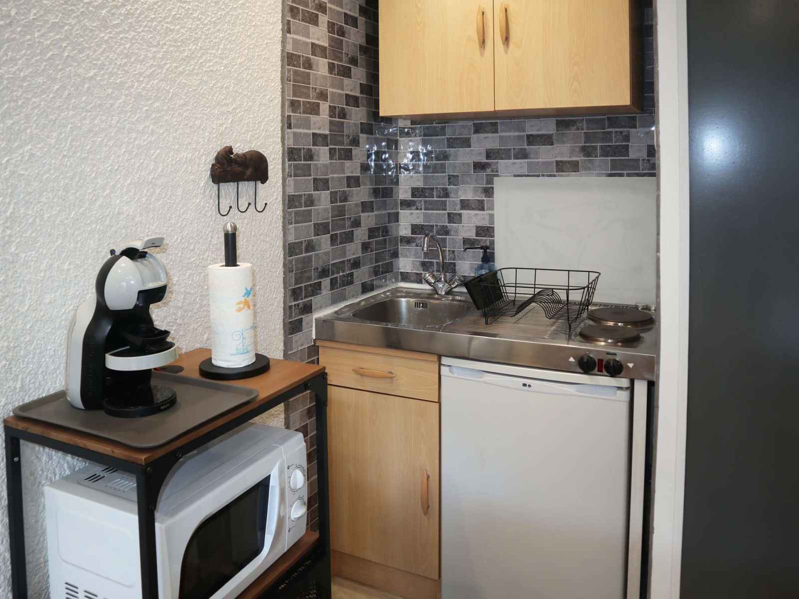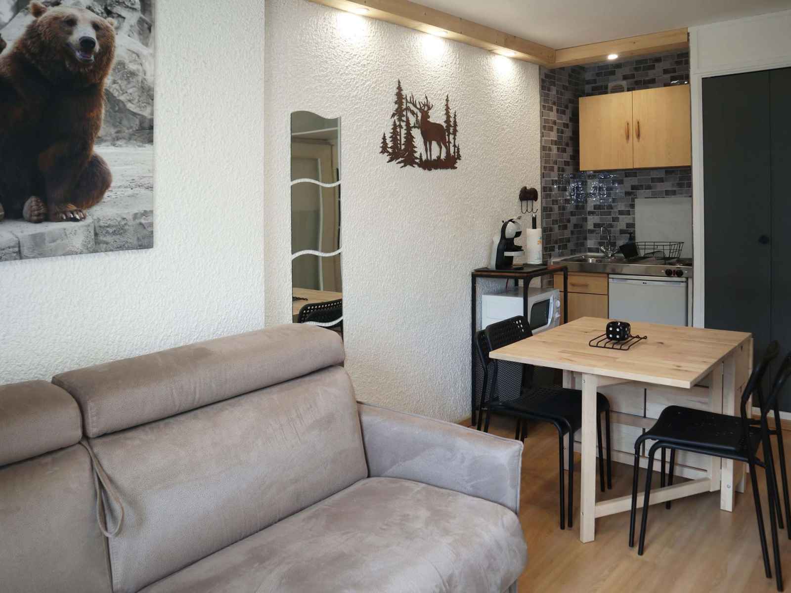 Très joli petit studio en étage élevé équipé pour deux personnes, entièrement rénové et idéalement situé en cœur de station avec accès direct aux pistes et aux commerces, 7ème étage avec assesseur, composé d'un séjour avec une banquette convertible pour deux en 160, d'un coin cuisine ouvert sur le séjour, d'une salle de bains