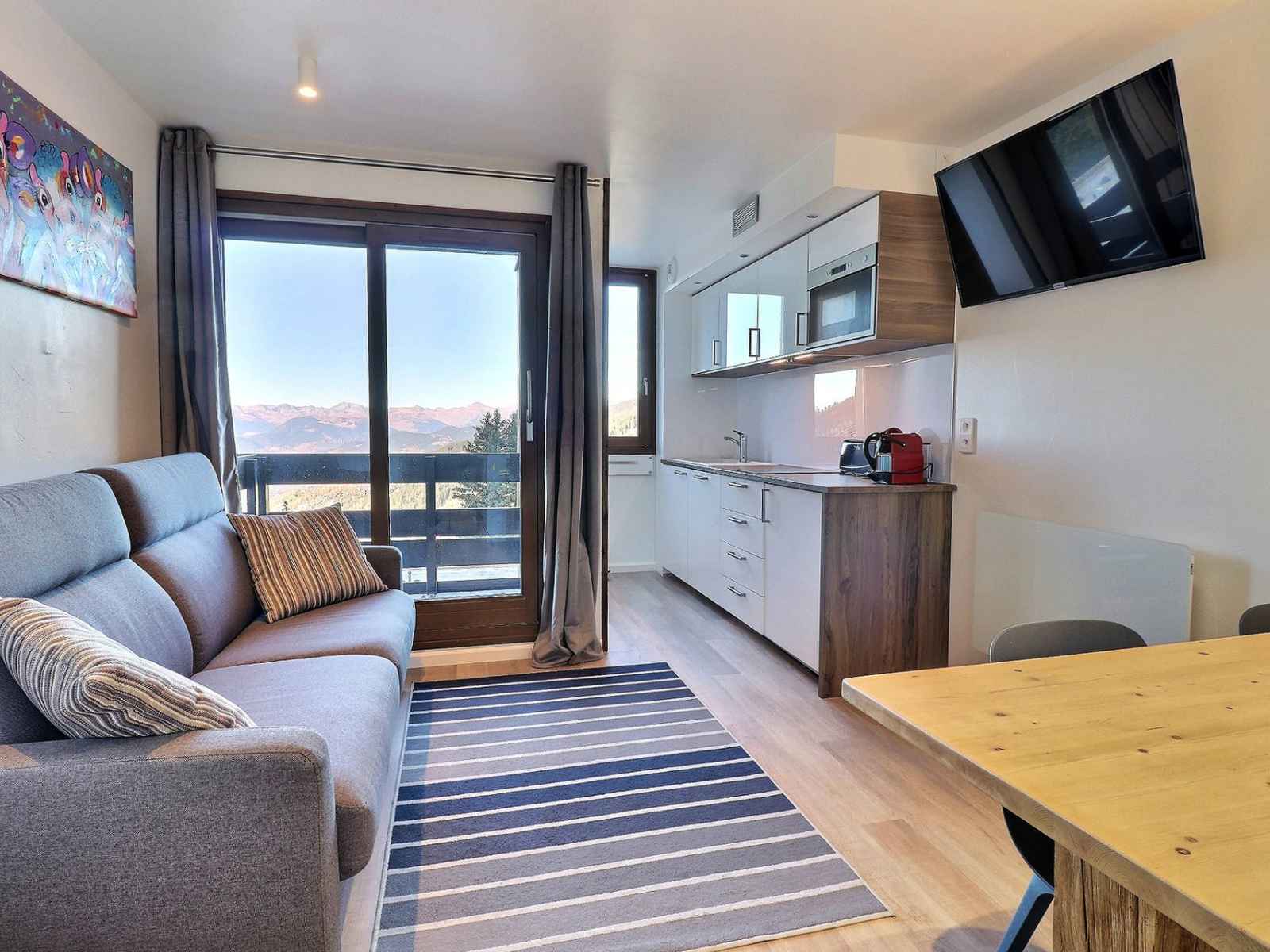 ascenseur. Les couchages Dans le séjour vous trouverez un canapé-lit 2 personnes et un lit simple. Le coin cuisine Il est équipé de plaques vitrocéramiques, d'un four, d'un micro ondes, d'un lave vaisselle et d'un réfrigérateur. Les sanitaires Une salle de bains avec baignoire et un WC séparé. Les équipements complémentaires Une télévision et un casier à skis. Connexion WIFI dans le hall de la résidence. Informations supplémentaires Nos amis les animaux ne sont pas tolérés dans le studio. Le linge de lit est inclus sauf pour les courts séjours et en été.