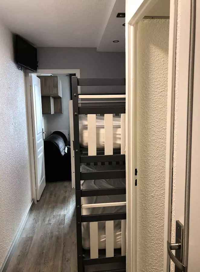 long de la journée. Fonctionnel et bien agencé, il dispose d’un coin cabine avec lits superposés, d’une cuisine ouverte équipée, ainsi que d’un séjour avec canapé-lit et un casier à skis.