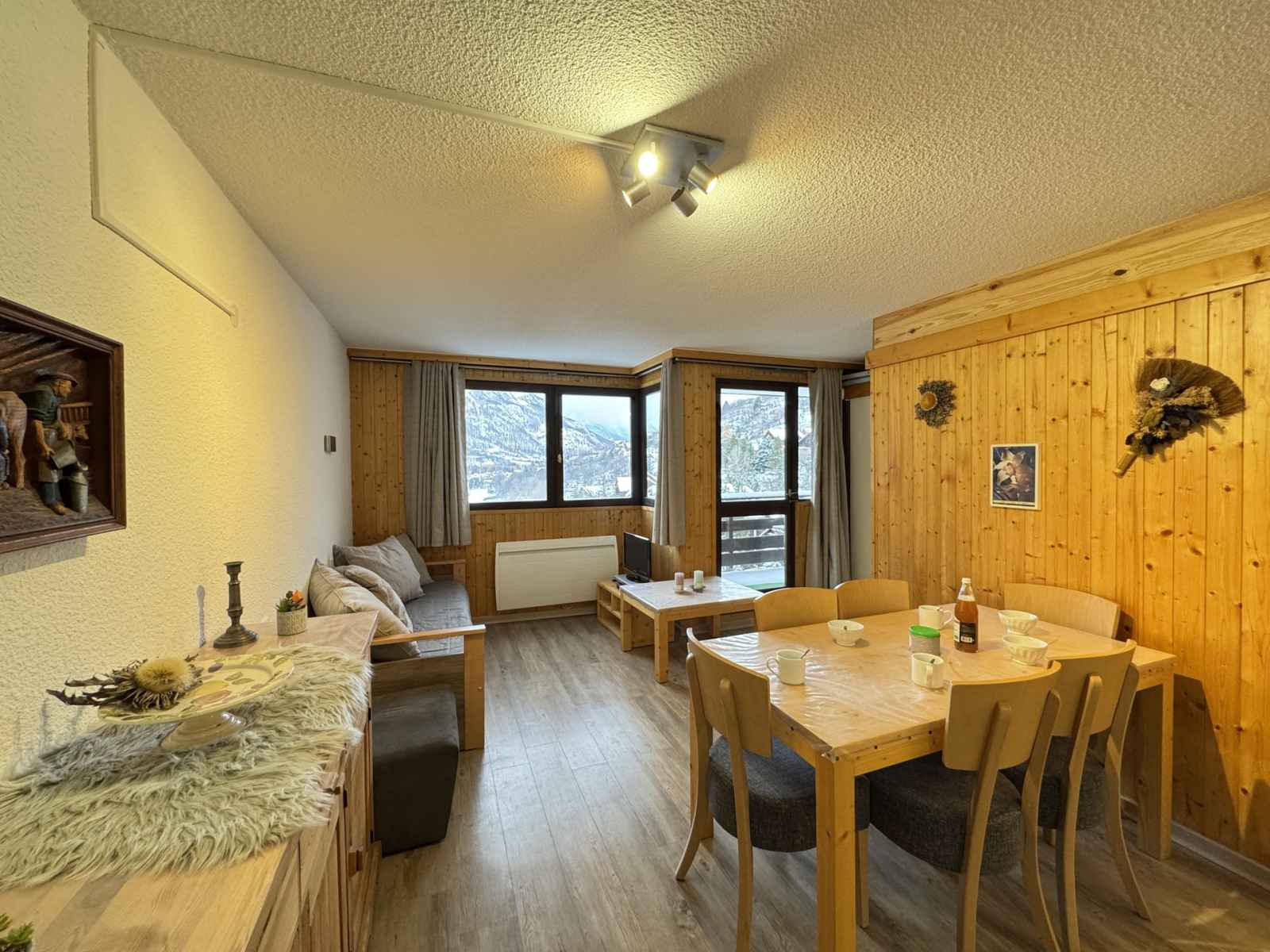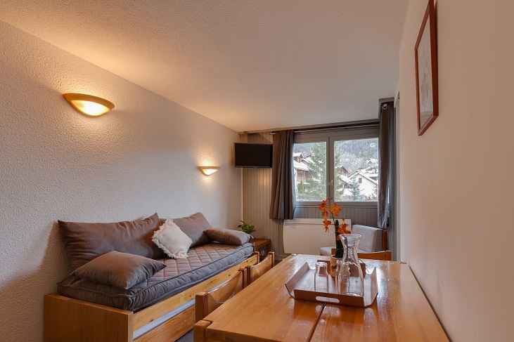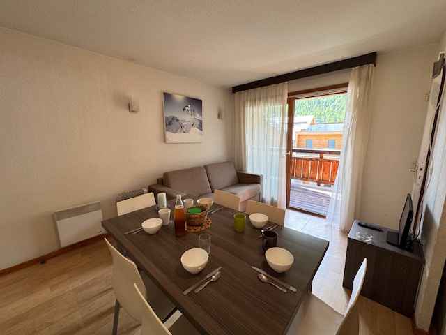 comprend un parking extérieur. Possibilité de louer une place de parking couvert. Vous trouverez dans l’appartement : Coin cuisine aménagé avec réfrigérateur, plaque vitro, four, four micro-ondes, lave-vaisselle et lave-linge. Un séjour avec un canapé lit gigogne, télévision Cabine avec un lit double en 140 Salle de bain avec baignoire et toilette séparé Accès à un casier à skis privé Prestations non incluses dans le tarif : Linge de toilette, Linge de lit, matériel Bébé, Ménage de fin de séjour Appartement non-fumeur Animaux acceptés (taxe de 50€ par animal)