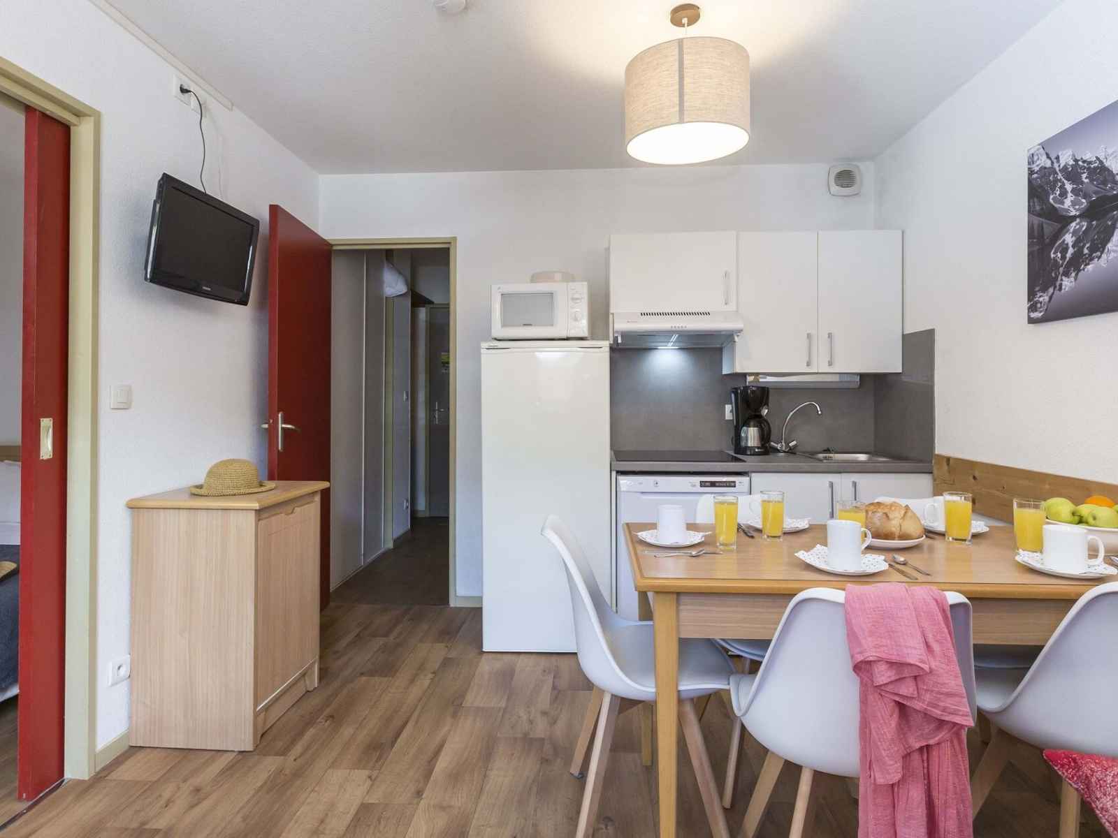 kitchenette équipée (lave-vaisselle, micro-ondes, réfrigérateur, plaque électrique, cafetière électrique, hotte)