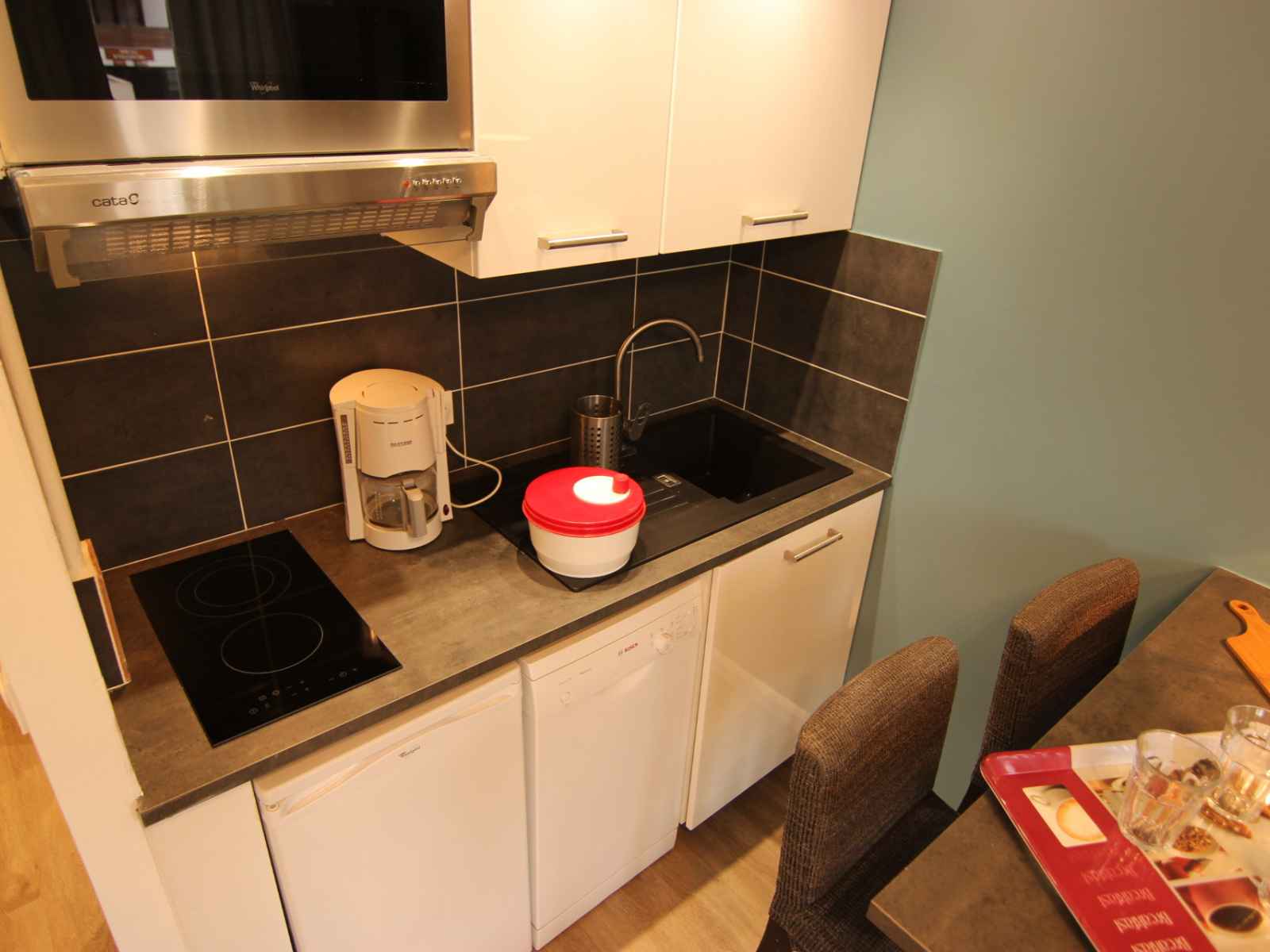 coin cuisine : four micro-ondes, réfrigérateur, plaques électriques et lave-vaisselle.