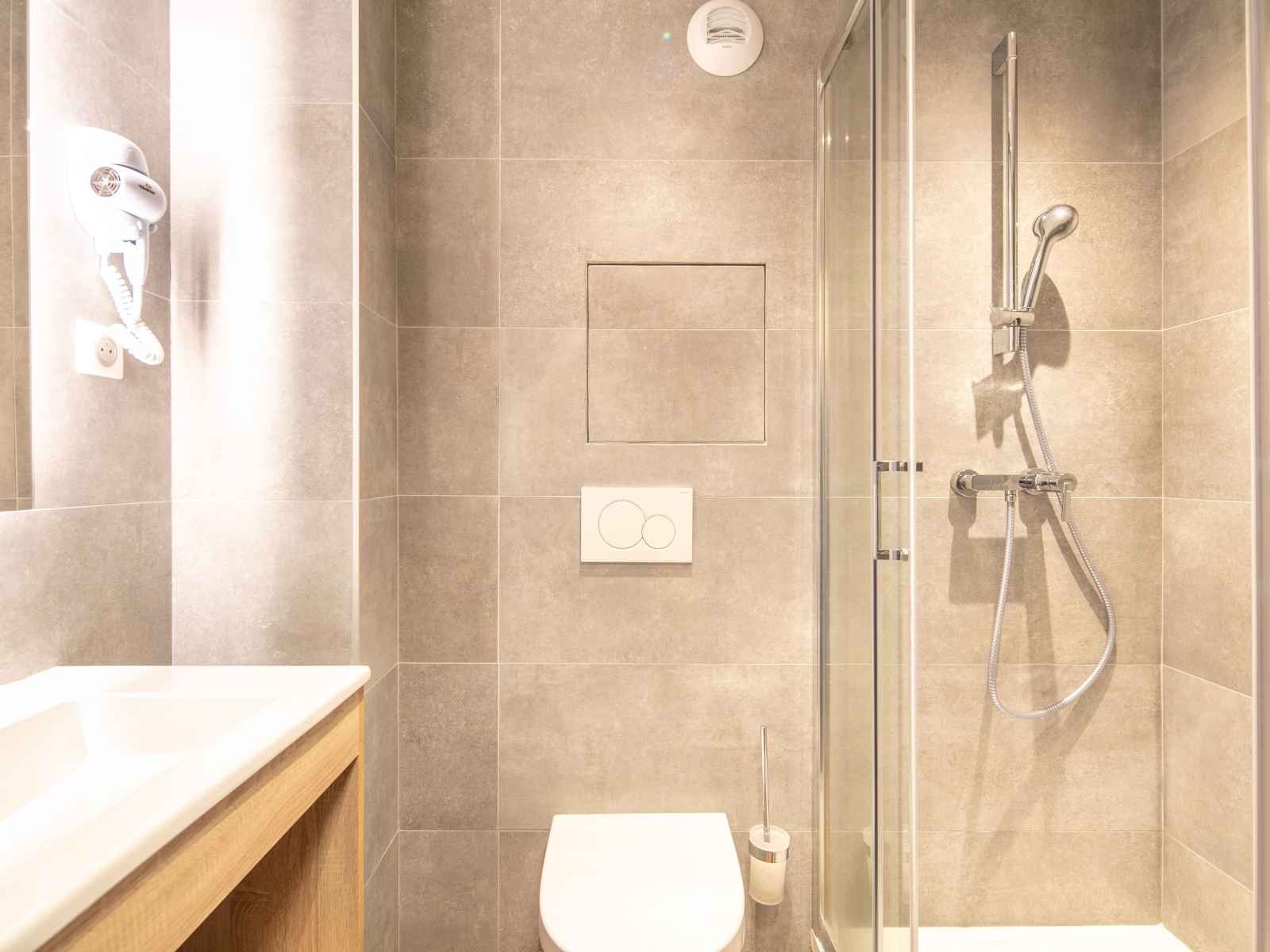 de bain avec douche et toilettes (dans la sdb) + sèche-cheveux