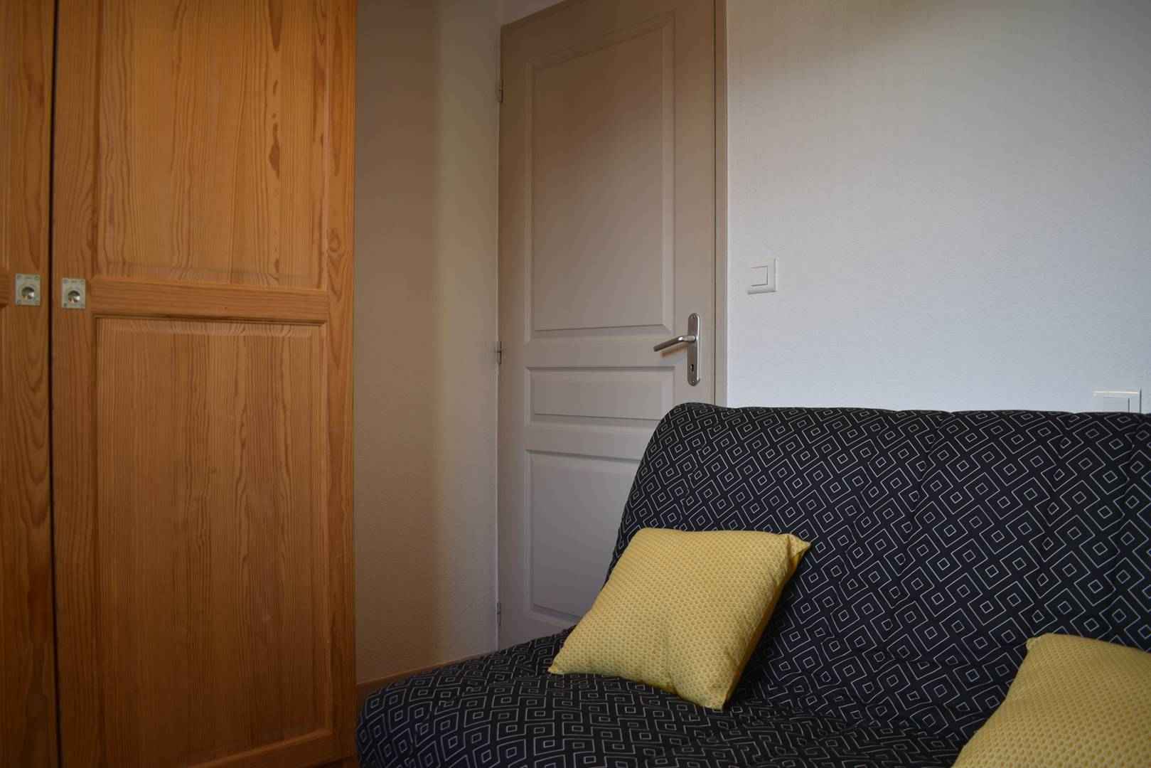 Chambre 1 : Lit convertible 2 personnes avec fenêtre donnant sur l’extérieur.