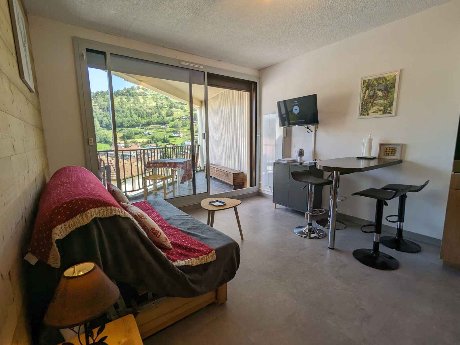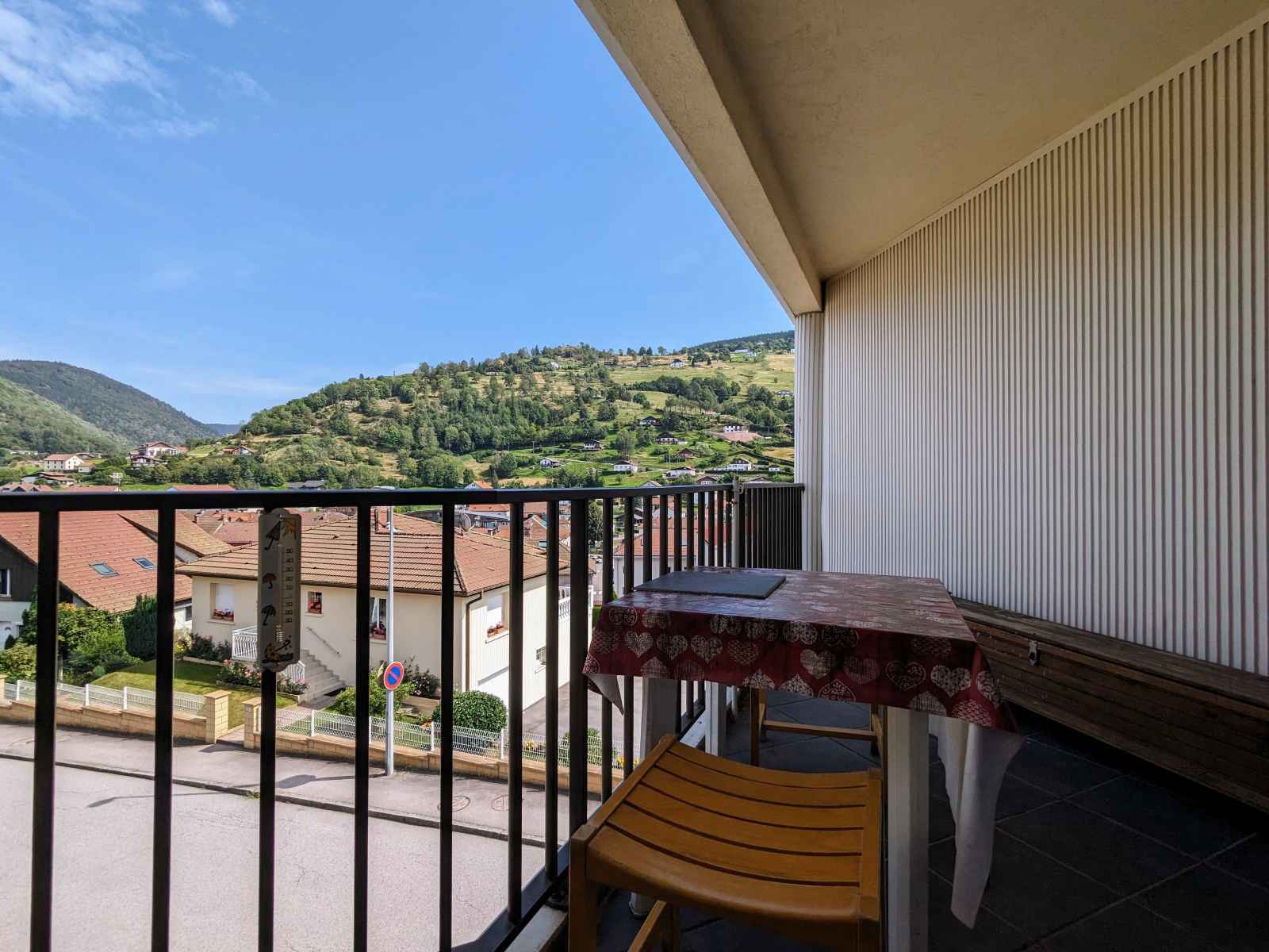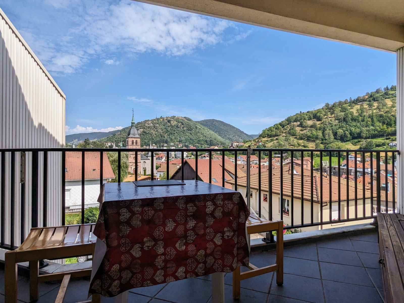 dans une rue au calme, profitez d'un large balcon couvert avec vue sur la ville et les montagnes.
