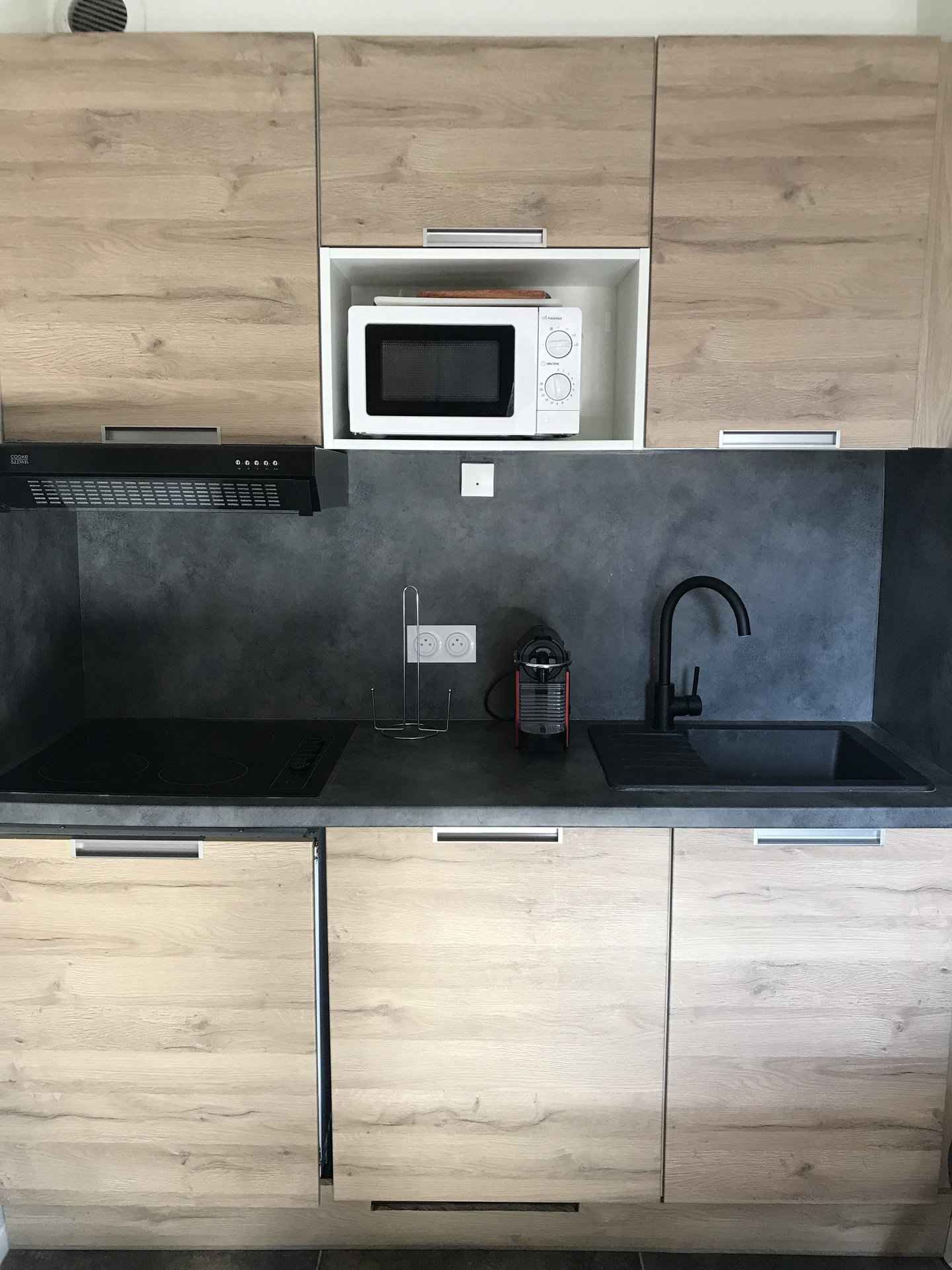 coin cuisine équipée avec plaques vitro-céramiques, hotte aspirante, réfrigérateur, lave-vaisselle, micro-ondes, cafetière à filtre, bouilloire, grille-pain, nécessaire de vaisselle.