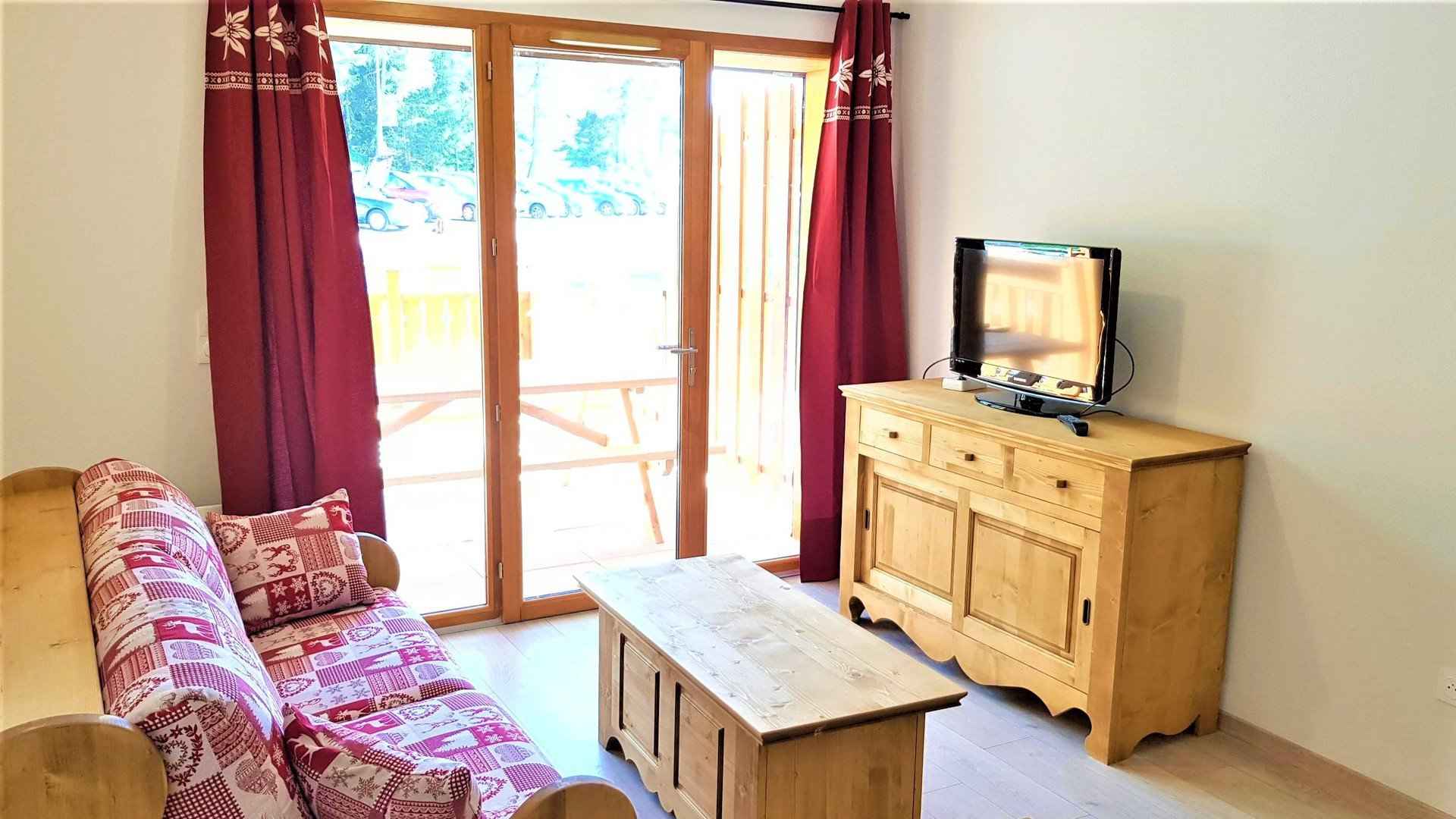 pièce à vivre avec télévision, canapé-lit ,coin repas.