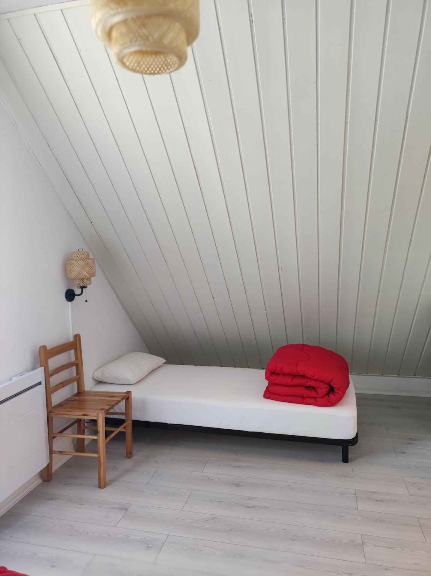 : 1er étage. - Séjour : canapé convertible. - Chambre 1: 1 lit double. - Chambre 2: 3 lits simples. SANITAIRES : - Salle de bains et WC séparés. Suppléments optionnels : Ménage fin de séjour : 89€ Supplément animal : 9€ / jour ou 45€ / semaine par animal Linge de lit + linge de toilette : 12 € / personne Kit bébé (lit parapluie + chaise haute) selon disponibilité : 15€ / semaine Suppléments obligatoires : Taxe de séjour non incluse, à régler sur place Caution (non encaissée, restituée au départ si aucune dégradation n'est constatée)