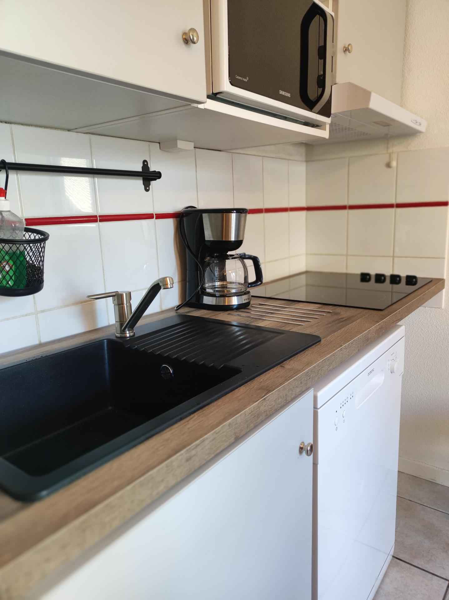 coin cuisine équipée avec plaques vitro-céramiques, hotte aspirante, réfrigérateur, lave-vaisselle, micro-ondes, cafetière à filtre, bouilloire, grille-pain, nécessaire de vaisselle.