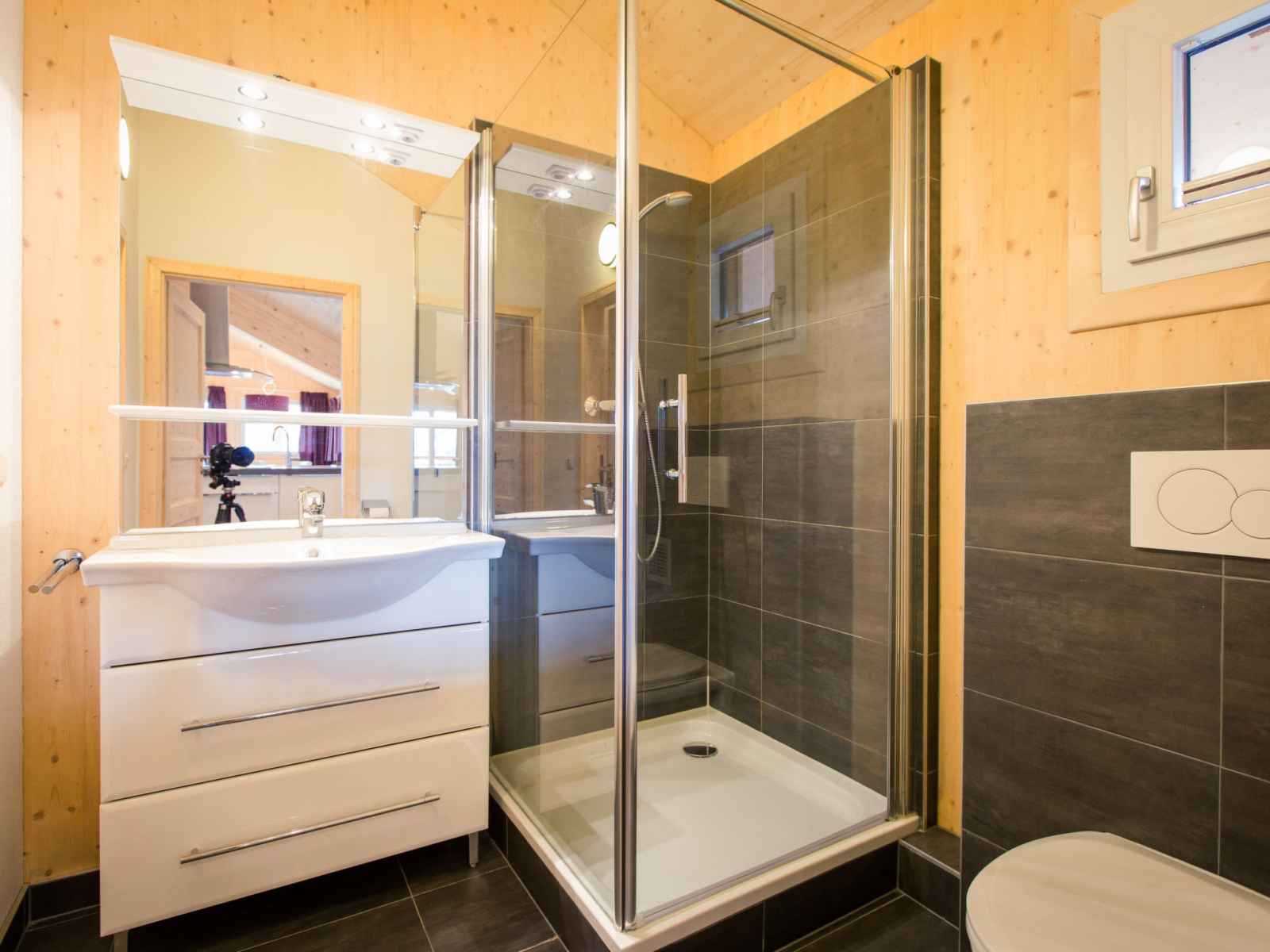 À l'étage supérieur: 2 chambres doubles. 1 chambre avec 2 lits. 1 chambre avec 2 x 2 lits superposés. 1 chambre avec 1 lit et 1 lit double. Bain/WC, douche/WC, balnéo, Sauna. Sol en bois. Balcon. Mobilier de balcon. Belle vue sur les montagnes. A disposition: Internet (Connexion WIFI, gratuit). Veuillez noter: logement non-fumeur. Le chalet dispose d'une salle de bain bien-être avec un bain à remous rond, d'une douche bien-être et d'une cabine infrarouge OU d'un sauna finlandais.