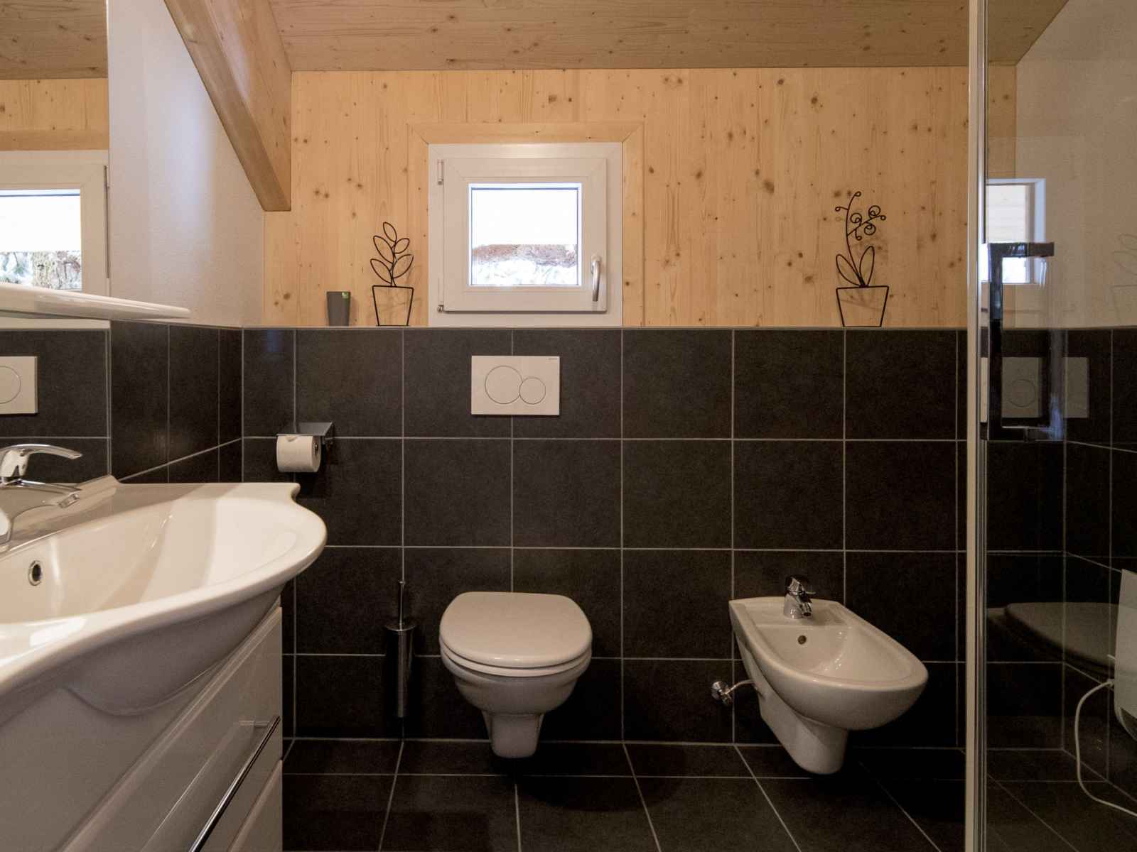 l'étage supérieur: 2 chambres doubles. 1 chambre avec 1 x 2 lits superposés, 1 lit double. 1 chambre avec 2 x 2 lits superposés. Bain/WC, douche/WC, balnéo, Sauna. Balcon. Mobilier de balcon. Belle vue sur les montagnes. A disposition: Internet (Connexion WIFI, gratuit). Veuillez noter: logement non-fumeur.