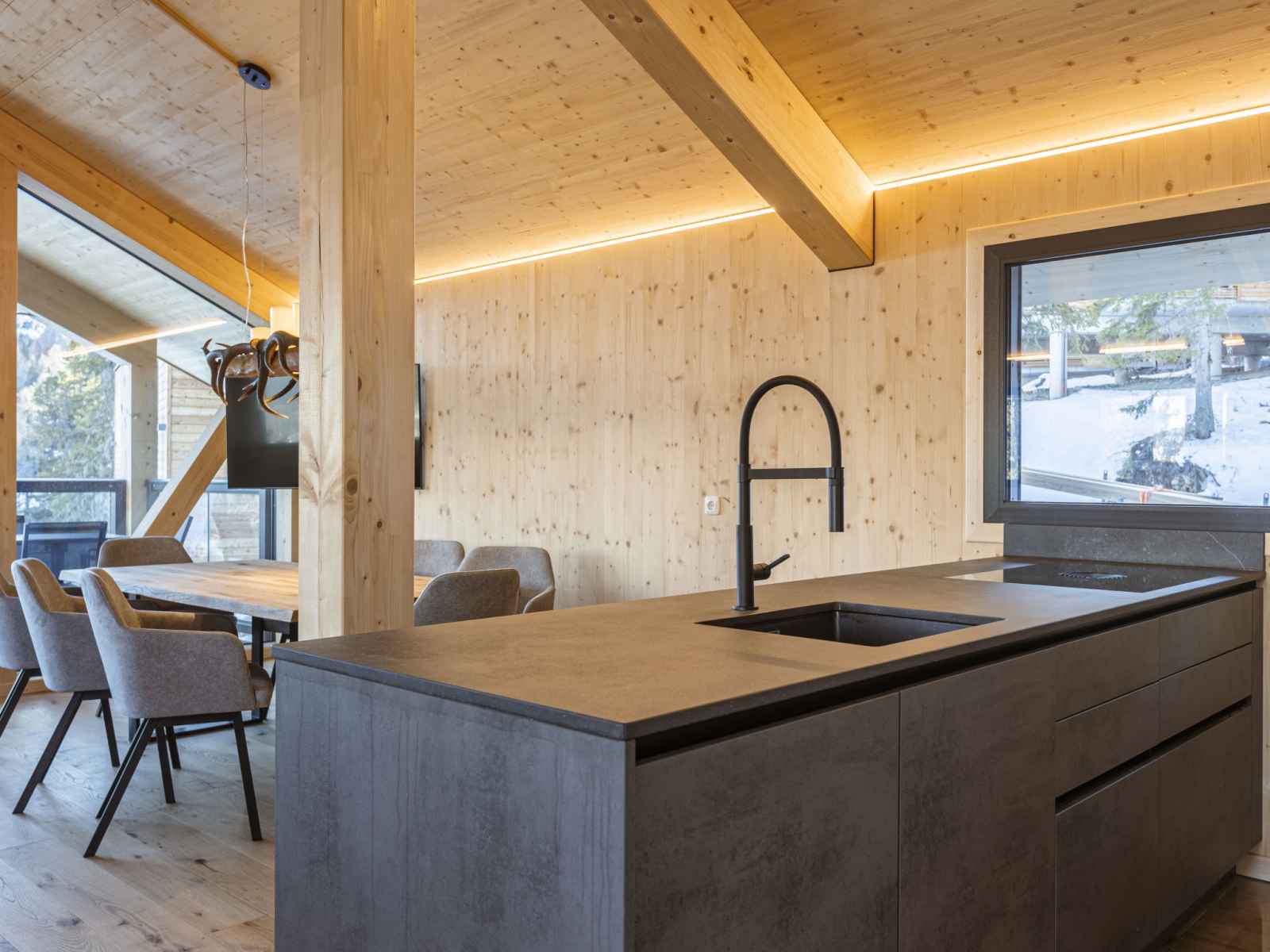 "superior 7 mit sauna & hot tub", chalet 5 pièces 135 m2 sur 2 niveaux. clair, aménagement moderne et de bon goût: séjour/salle à manger avec coin repas et tv (satellite) (écran plat). 4 chambres doubles. cuisine ouverte (four, lave-vaisselle, 4 plaques vitrocéramiques, grille-pain, bouilloire électrique, micro-ondes, cafetière